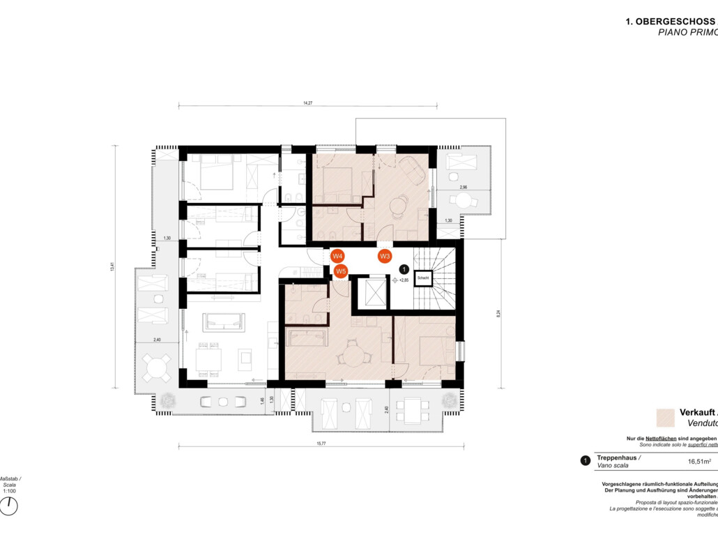 W4: L'appartamento si trova al primo piano ed è composto da: ingresso, soggiorno con cucina, 3 stanze da letto, 2 bagni e terrazza.