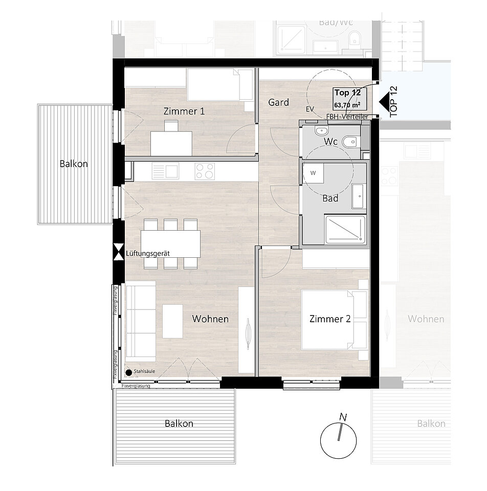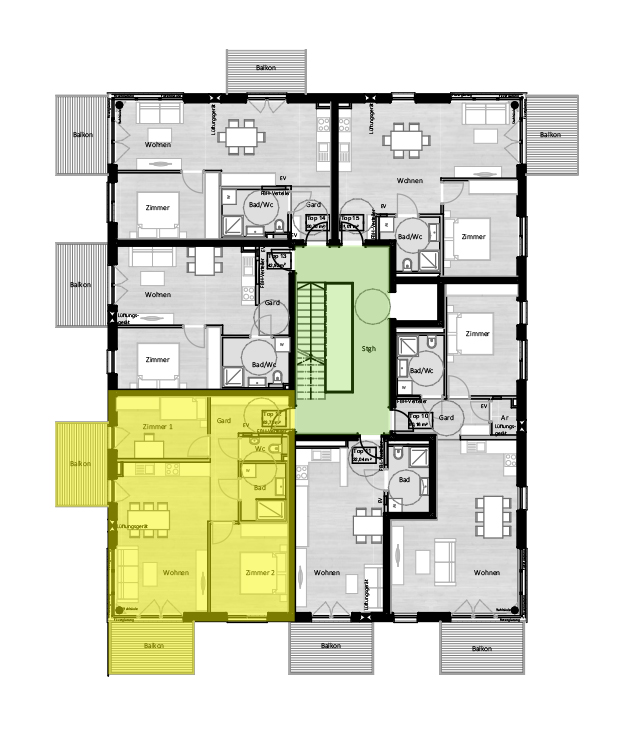Diese Dreizimmerwohnung besteht aus einer geräumigen Wohnküche, zwei Schlafzimmern, einem Badezimmer und einem WC. Zwei Balkone vervollständigen die Wohnung. Ein Keller im Untergeschoss ist ebenfalls im Preis inbegriffen. Stellplätze in der Tiefgarage sind ab 25.680 € erhältlich. Die angegebenen Preise sind für Anleger und verstehen sich zuzüglich Umsatzsteuer. Preise für Eigennutzer auf Anfrage.