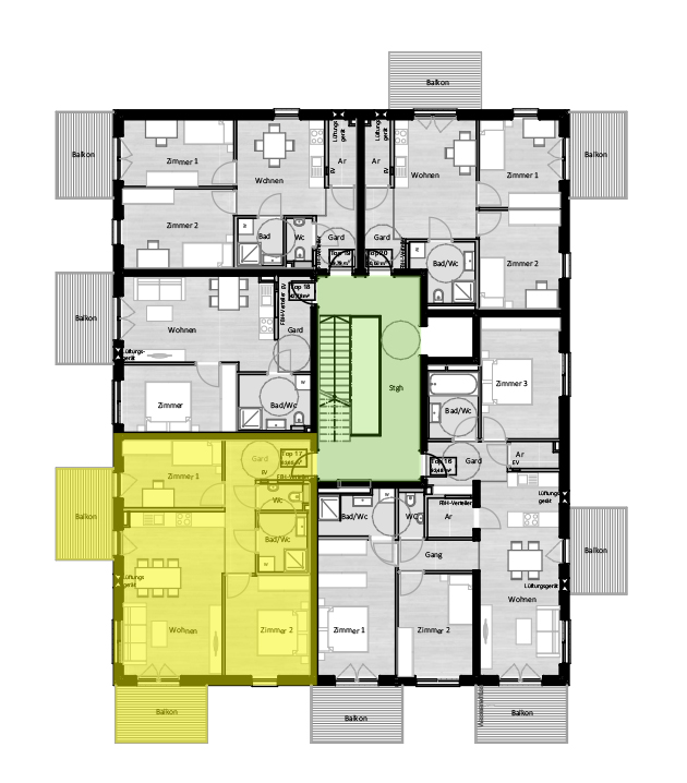 Diese Dreizimmerwohnung besteht aus einer geräumigen Wohnküche, zwei Schlafzimmern und zwei Bädern. Zwei Balkone vervollständigen die Wohnung. Ein Keller im Untergeschoss ist ebenfalls im Preis inbegriffen. Stellplätze in der Tiefgarage sind ab 25.680 € erhältlich. Die angegebenen Preise sind für Anleger und verstehen sich zuzüglich Umsatzsteuer. Preise für Eigennutzer auf Anfrage.