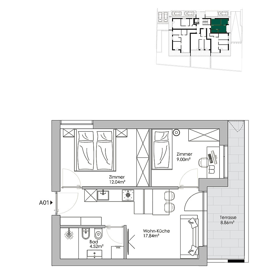 Konventionierte Dreizimmerwohnung im Erdgeschoss mit Wohnküche, zwei Schlafzimmern, einem Bad, einer Terrasse und einem Keller.