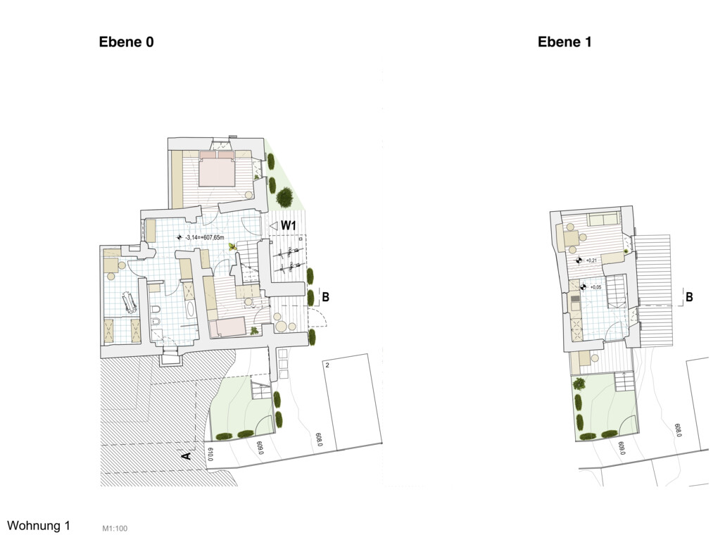 - Ebene 0: Eingang, 2 Schlafzimmer, Badezimmer mit Fenster, Abstellraum, Privatgarten.