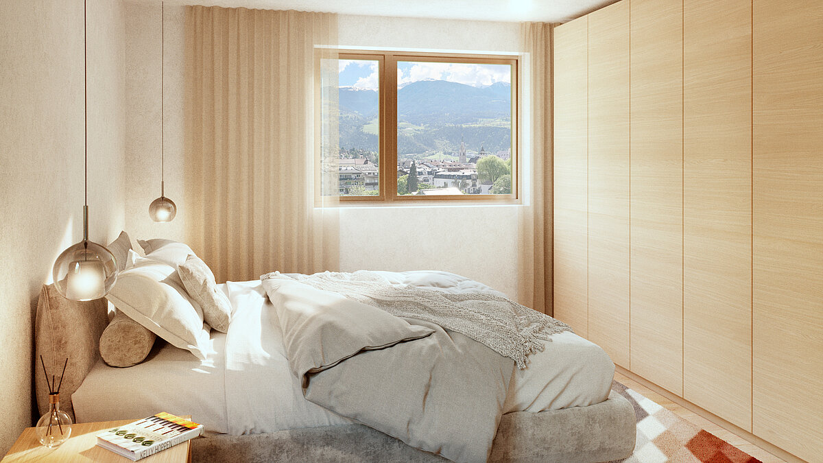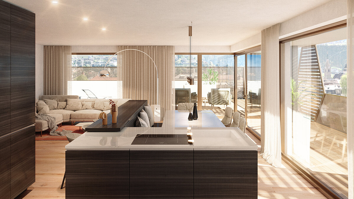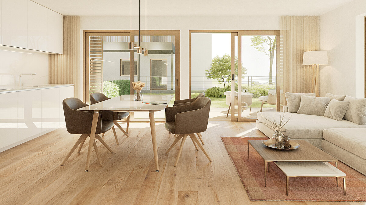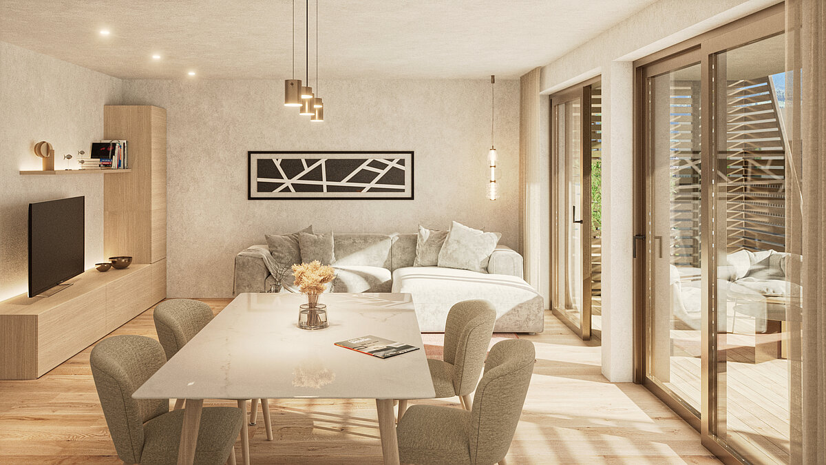 Diese Dreizimmerwohnung befindet sich im 1. Obergeschoss und verfügt über eine geräumige Wohnküche, zwei Schlafzimmer, ein Badezimmer, ein Südbalkon und einen Keller. Eine Garage kann zusätzlich erworben werden. Die Wohnung ist konventioniert und daher für Ansässige reserviert.