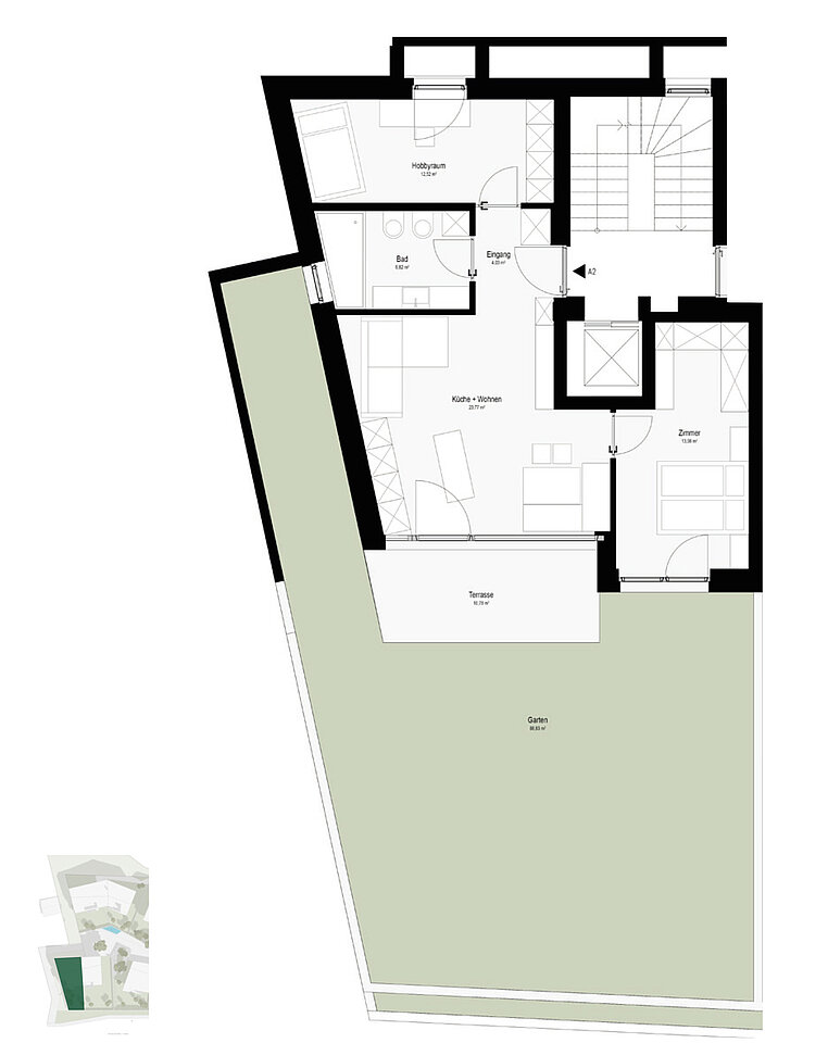 Die Wohnung im Erdgeschoss umfasst eine helle Wohnküche, ein gemütliche Schlafzimmer, ein Hobbyraum mit zusätzlicher Schlafmöglichkeit und ein Badezimmer mit Fenster und Badewanne. Abgerundet wird die Einheit mit einer Terrasse und einem Privatgarten, welcher nach Süden hin ausgerichtet ist.