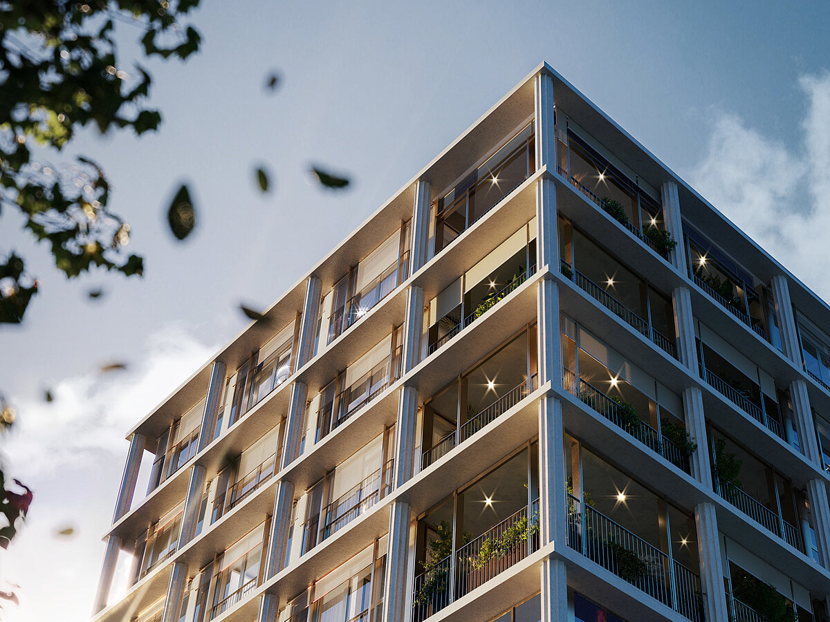 Die Wohngebäude sind eingebettet in eine begrünte Dachlandschaft. In privaten Gärten, Loggien oder Terrassen genießen Sie Ruhe und Natur und sind dabei mitten in der Stadt.