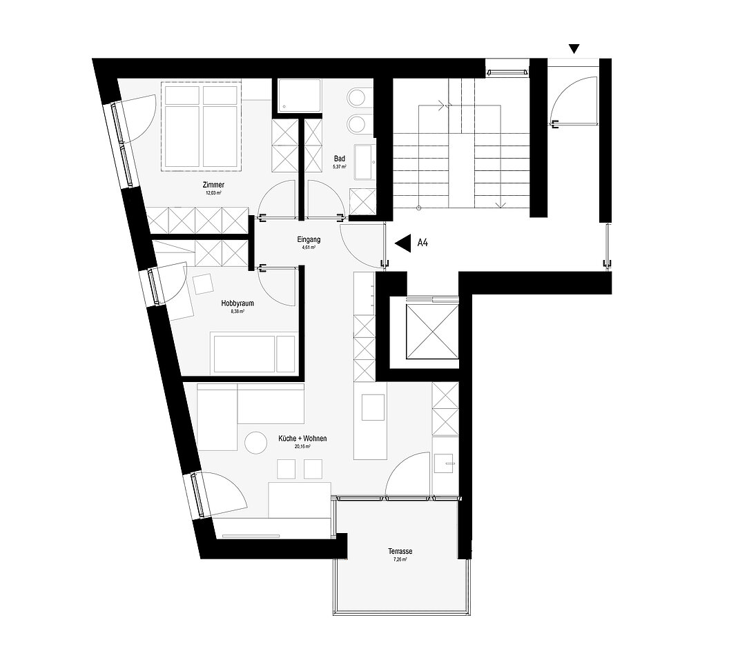 Die Wohnung im ersten Obergeschoss umfasst eine helle, einladende Wohnküche, ein Schlafzimmer, einen Hobbyraum und ein Badezimmer mit Dusche. Für entspannte Stunden im Freien sorgt der nach Süden ausgerichtete Balkon.
