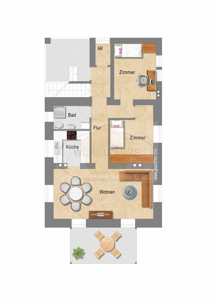 Im Erdgeschoss befindet sich eine Dreizimmerwohnung bestehend aus Diele, Küche, geräumigen Wohnzimmer , 2 Schlafzimmern, Badezimmer, Abstellraum und großzügigem Garten, welcher sich auf der Südseite des Gebäudes befindet und über das helle Wohnzimmer erreichbar ist.