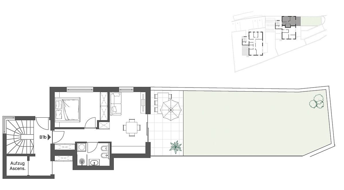 Diese Immobilie verfügt über einen hellen Wohn- und Essbereich mit direktem Zugang zur Südterrasse, ein Schlafzimmer und ein Badezimmer. Ein großer Garten mit ca. 80 Quadratmetern ist perfekt für Garten- und Outdoorliebhaber geeignet. Im Untergeschoss befindet sich ein Kellerabteil für weitere Abstellmöglichkeiten. Garagenplätze können separat für 30.000 € erworben werden.