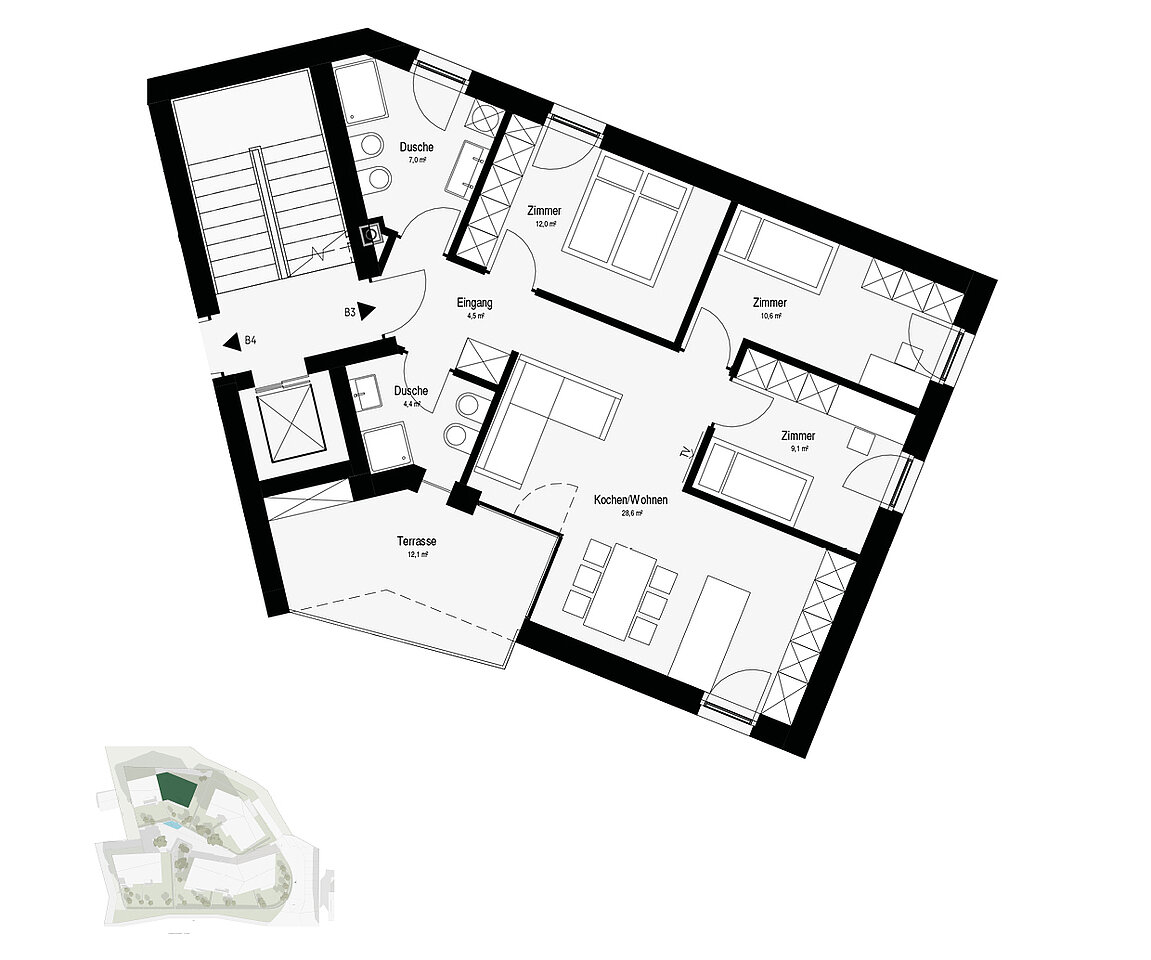 Geräumige Vierzimmerwohnung im Neubauprojekt Gisse in St. Sigmund im ersten Obergeschoss. Die Wohnung umfasst eine helle großzügige Wohnküche mit ca. 28 Quadratmetern, drei gemütliche Schlafzimmer und zwei Badezimmer mit Dusche. Der 12 Quadratmeter große Balkon rundet das Angebot ab.