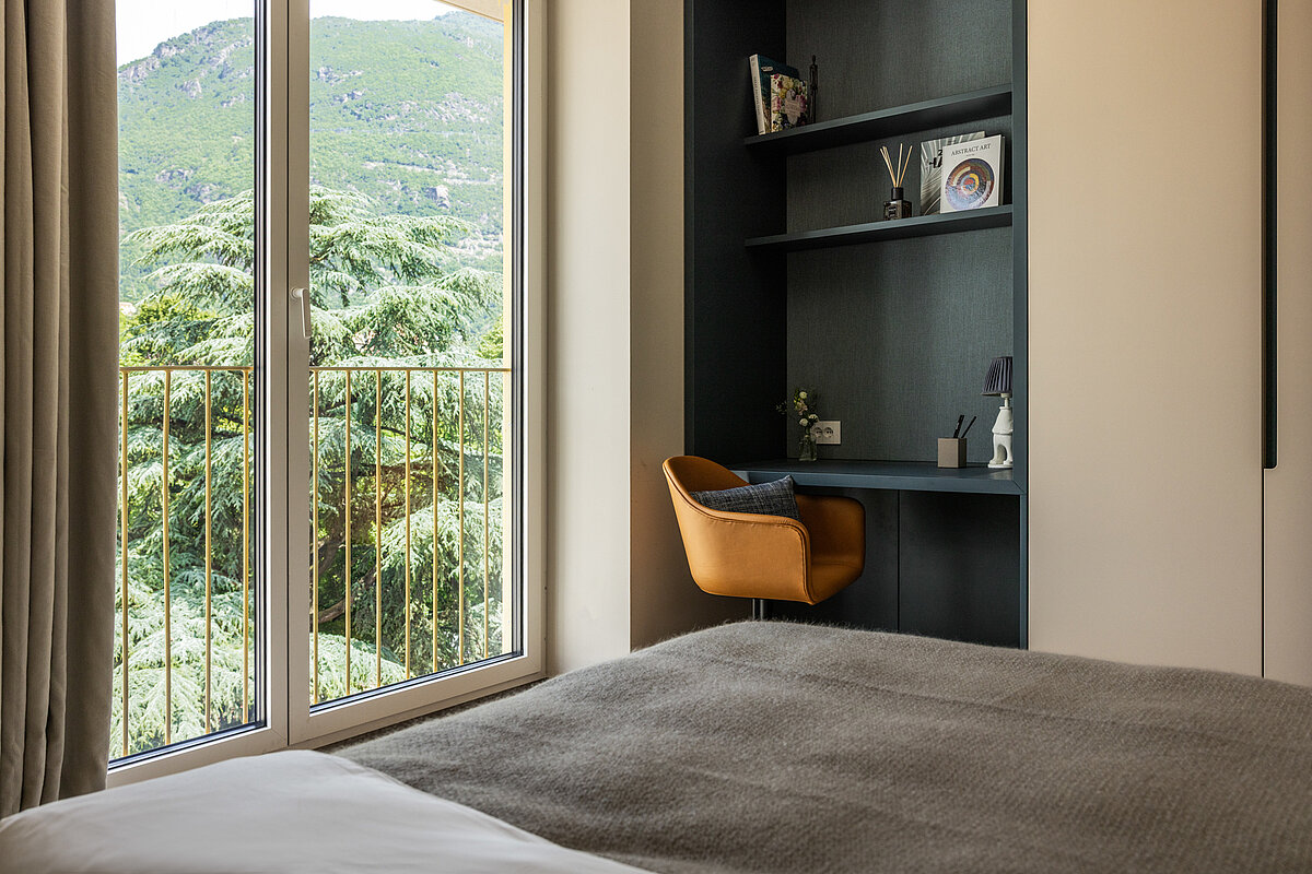 Die Ausstattung ist geprägt von innovativem italienischem Design – minimalistisch und wohnlich zugleich. Hochwertig verarbeitete natürliche Materialien, viele von Anbietern aus der Region, zeugen von Handwerkskunst Made in Italy und schaffen ein Ambiente von zeitloser Eleganz.