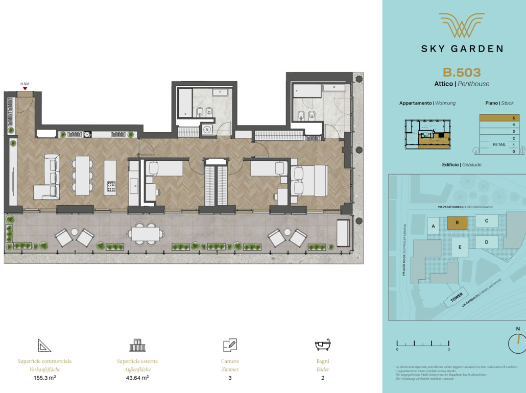 WOHNUNG B503 - Sky Garden B: Zum Verkauf steht eine neue, traumhafte Penthousewohnung mit großer Terrasse im 5. OG - interne Einteilung wie folgt: Eingang, Wohnraum mit Küche, 3 Schlafzimmer (eines davon mit Masterbad), Badezimmer und Terrasse.