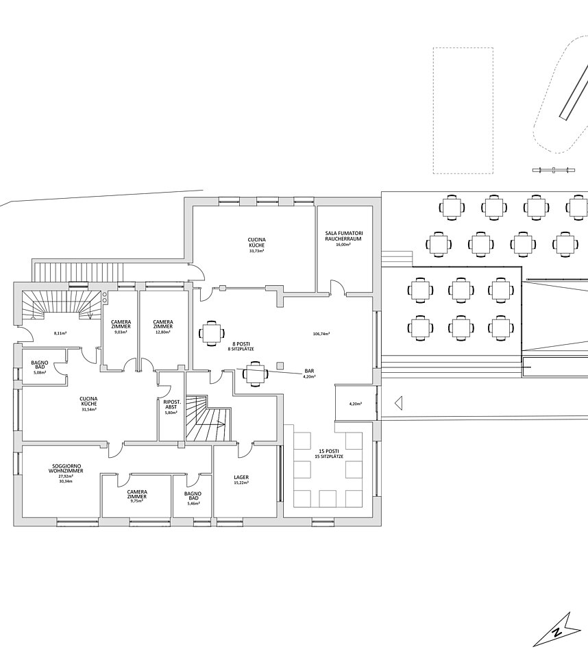 Geräumige Bar/Restaurant in strategischer Lage mit großer Terrasse. Zu der Immobilie gehören zudem Stellplätze im Freien und Motorradplätze.