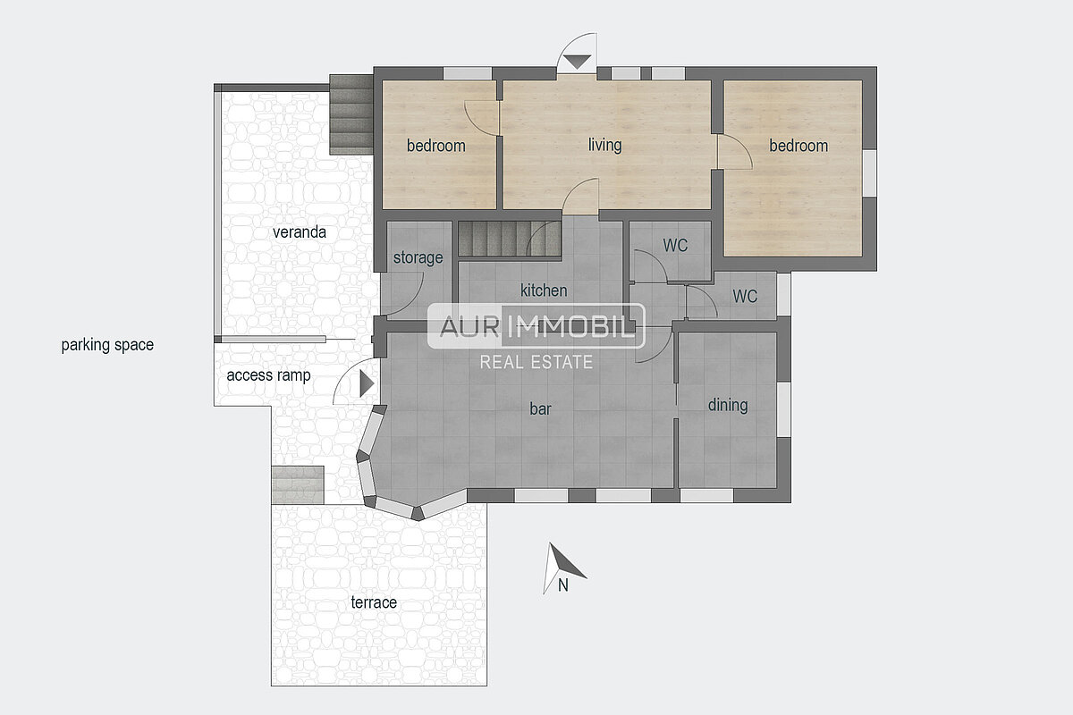 Zur Immobilie gehört außerdem eine gemütliche Wohnung auf zwei Etagen sowie ein großzügiger Parkplatz für Gäste und Bewohner.