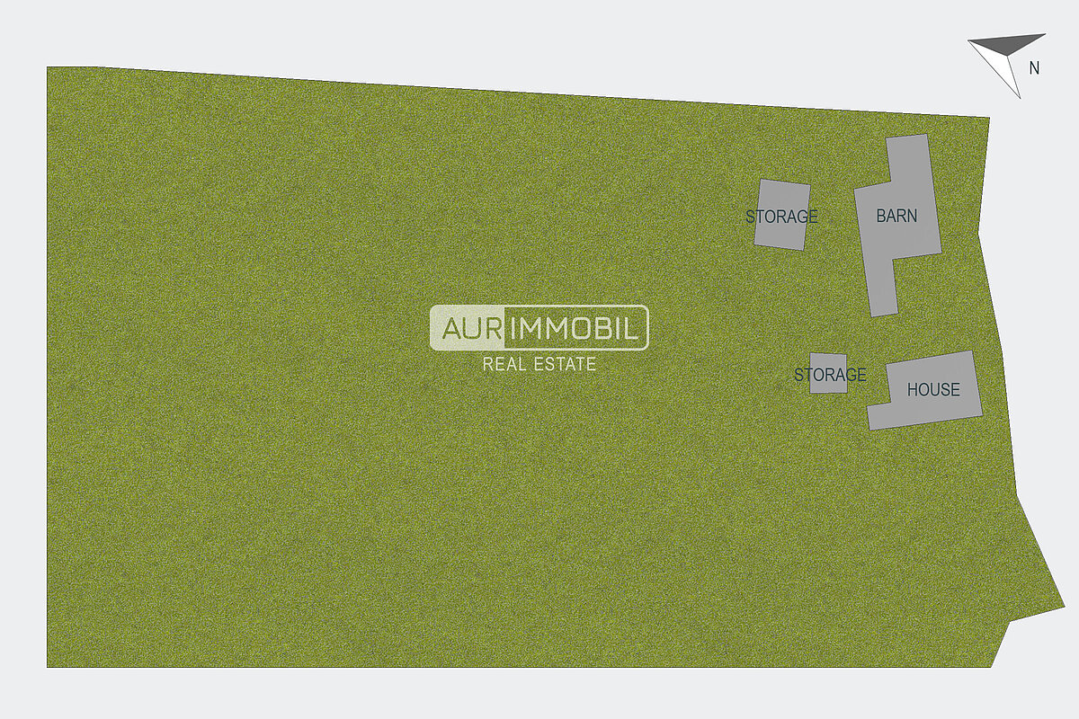 Es handelt sich nicht um einen geschlossenen Hof, umgeben von etwa 1,1 Hektar Wiese und 1,2 Hektar Wald.