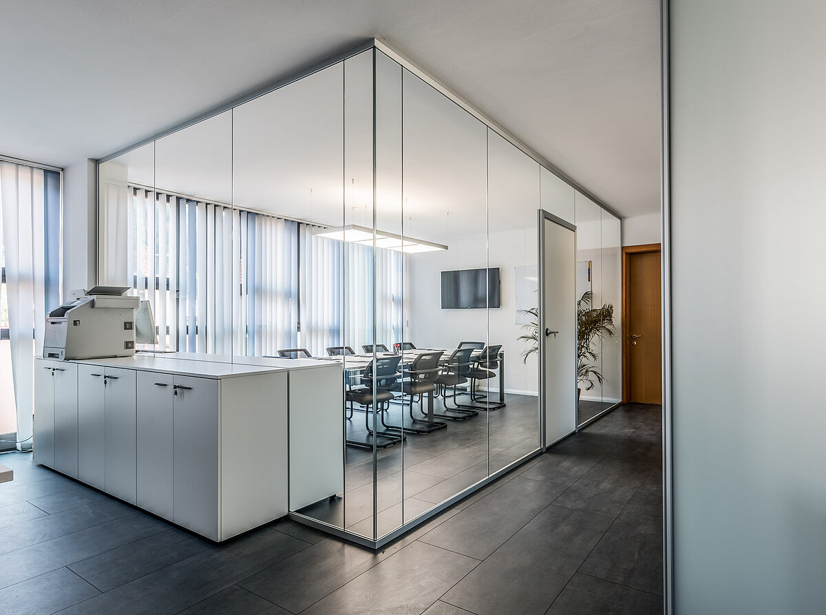 Die Innenräume sind durch modulare Glaswände strukturiert, die eine flexible Neugestaltung je nach betrieblichen Anforderungen ermöglichen. Heizung und Kühlung erfolgen autonom über Fan-Coils.