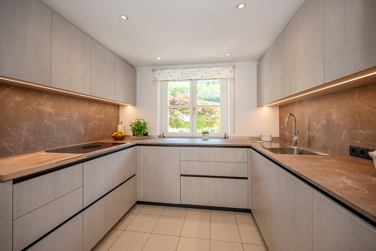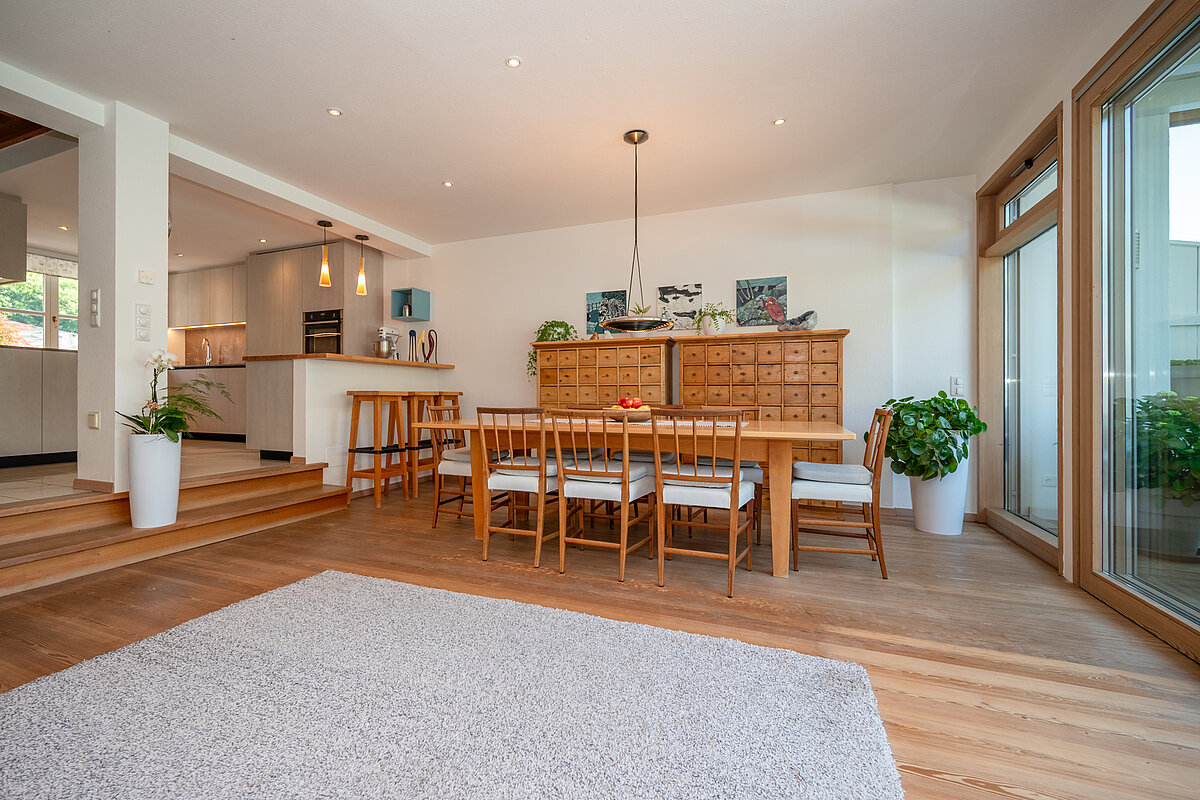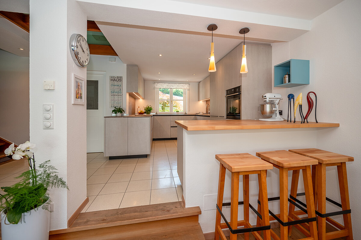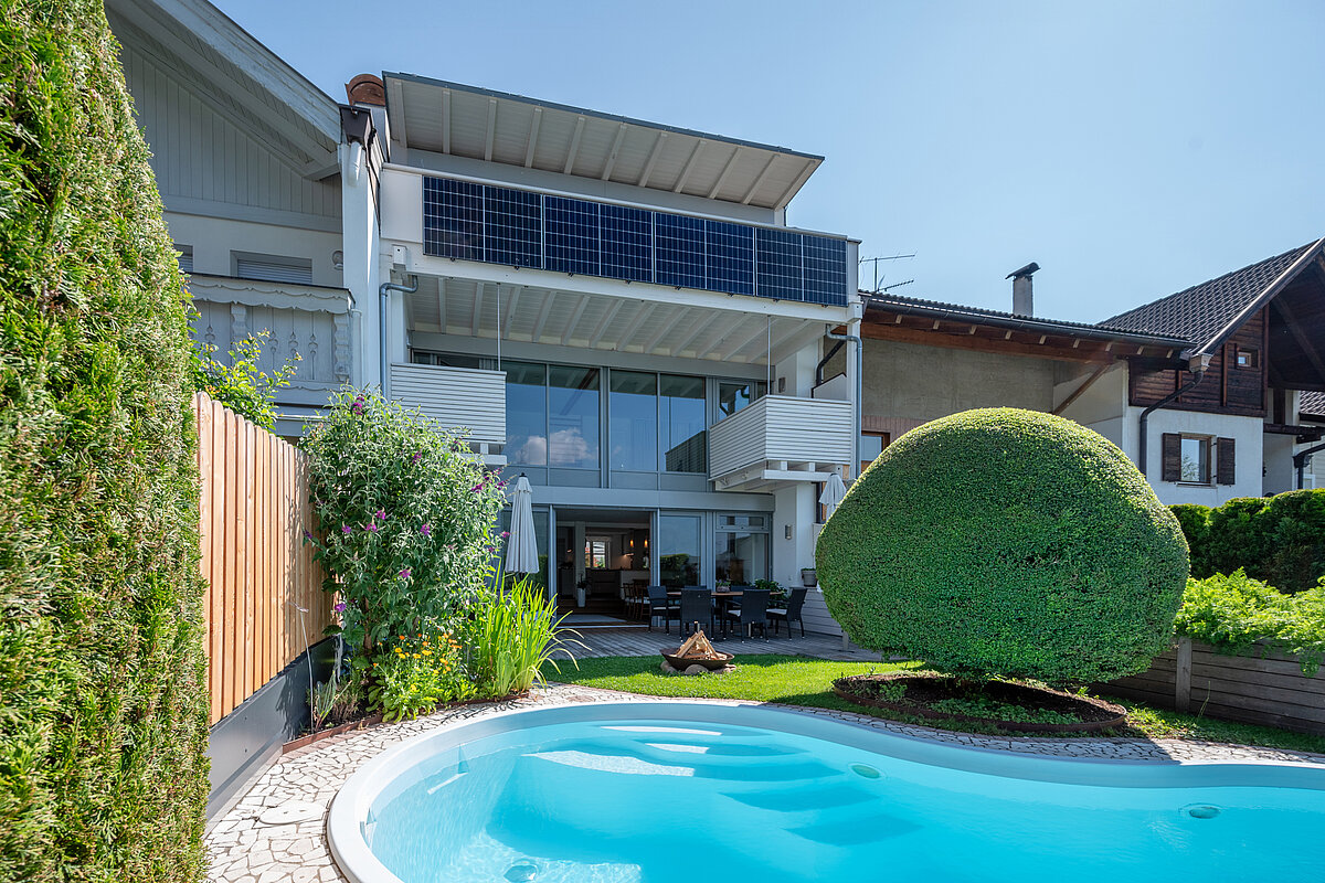 In Aicha erwartet Sie dieses gepflegte und im Jahr 2003 komplett sanierte Reihenhaus. Diese teilmöblierte Immobilie bietet einen großzügigen Wohnraum mit voll ausgestatteter Küche, gemütlichem Essbereich und Gäste-WC im Erdgeschoss. Direkt vom Wohnzimmer aus erreichen Sie die sonnige Terrasse mit Pool, der an heißen Tagen für erfrischende Abkühlung sorgt. Eine Holztreppe führt ins erste Obergeschoss. Dort befinden sich ein Schlafzimmer, ein Badezimmer mit Balkon und ein Fitnessraum mit zwei Balkonen, dieser kann bei Bedarf mit wenig Aufwand in zwei Schlafzimmer mit jeweils einem Balkon umgebaut werden. Im zweiten Obergeschoss erwarten Sie zwei weitere Schlafzimmer, eine Terrasse, ein Badezimmer und ein Abstellraum. Das Untergeschoss verfügt über diverse Kellerräume, einen überdachten Stellplatz und eine Waschküche.