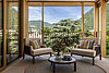 Hohe Panoramafenster schaffen lichtdurchflutete Räume und bieten einzigartige Ausblicke auf die Dächer der Stadt, den umgebenden Park und die Berge.
