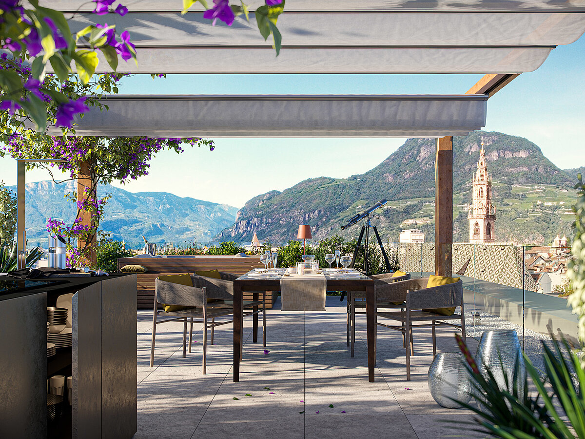 Die Wohngebäude sind eingebettet in eine begrünte Dachlandschaft. In privaten Gärten, Loggien oder Terrassen genießen Sie Ruhe und Natur und sind dabei mitten in der Stadt.