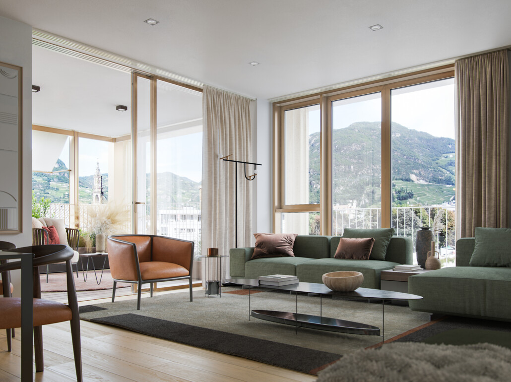 Ein Wohngebäude, das allen erdenklichen Bedürfnissen gerecht wird: Von kompakten Ein- oder Zweizimmerwohnungen bis hin zu großzügigen Apartments mit drei oder vier Zimmern. Fünf der Gebäude oberhalb des Shoppingcenters sind italienisch-eleganten Wohnungen gewidmet. Vom jeweils dritten bis siebten Obergeschoss warten flexible Einheiten auf ihre Besitzer, von der Singlewohnung über den Zweitwohnsitz bis zum Penthouse. Für ein Höchstmaß an Licht und Luft verfügt jede von ihnen über eine Loggia, Terrasse oder einen privaten Garten. Die bepflanzten Dachflächen im 3. Obergeschoss garantieren einen privaten und sicheren Zugang zu den Wohnungen umgeben von der Natur. Von hier kann der Blick schweifen: auf den Ritten, den Rosengarten und die Altstadt mit Waltherplatz und Bozner Dom.