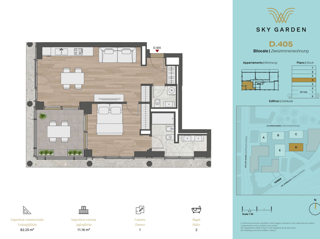 WOHNUNG D405 - WaltherPark Sky Garden D: Zum Verkauf steht eine neue, große Zweizimmerwohnung mit Terrasse im 4. OG - interne Einteilung wie folgt: Eingang, Wohnraum mit Küche, Schlafzimmer mit privatem Masterbad, Tages-WC und Terrasse.