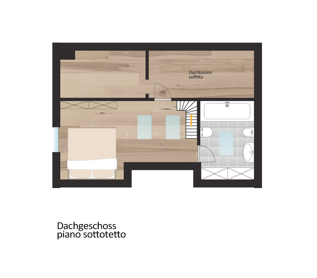 Im ersten Obergeschoss erwarten Sie ein einladender Eingangsbereich, ein helles Bad sowie eine großzügige Wohnküche mit abtrennbarem Schlafbereich. Im Dachgeschoss befinden sich ein weiteres Schlafzimmer, ein zweites modernes Bad sowie ein geräumiger Dachboden mit viel Stauraum. Zur Wohnung gehören außerdem ein Kellerabteil und eine Garage, die zusätzlichen Komfort bieten.