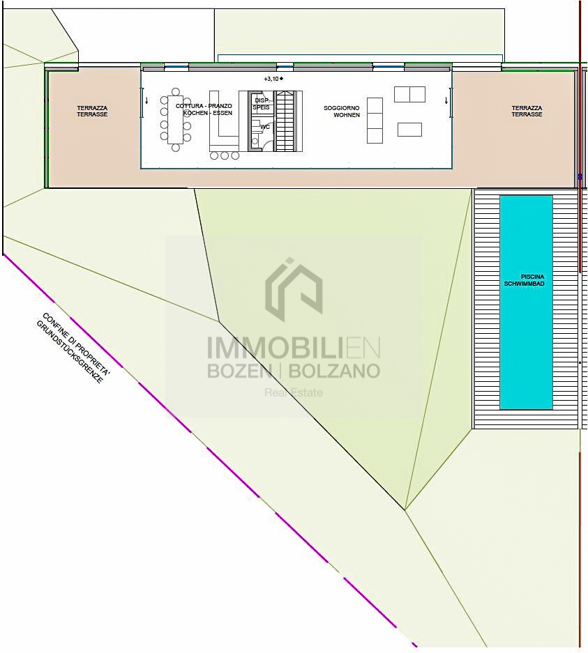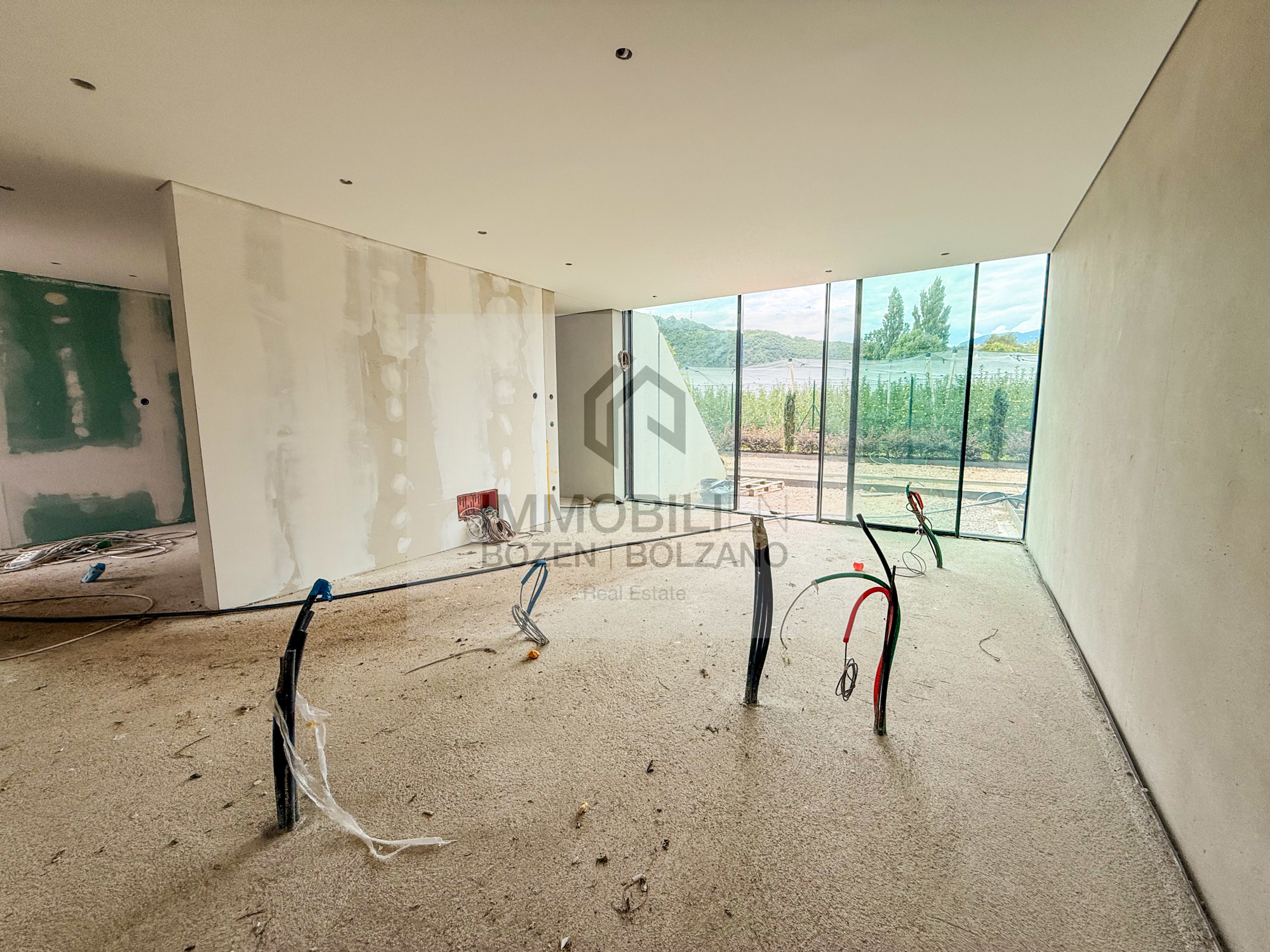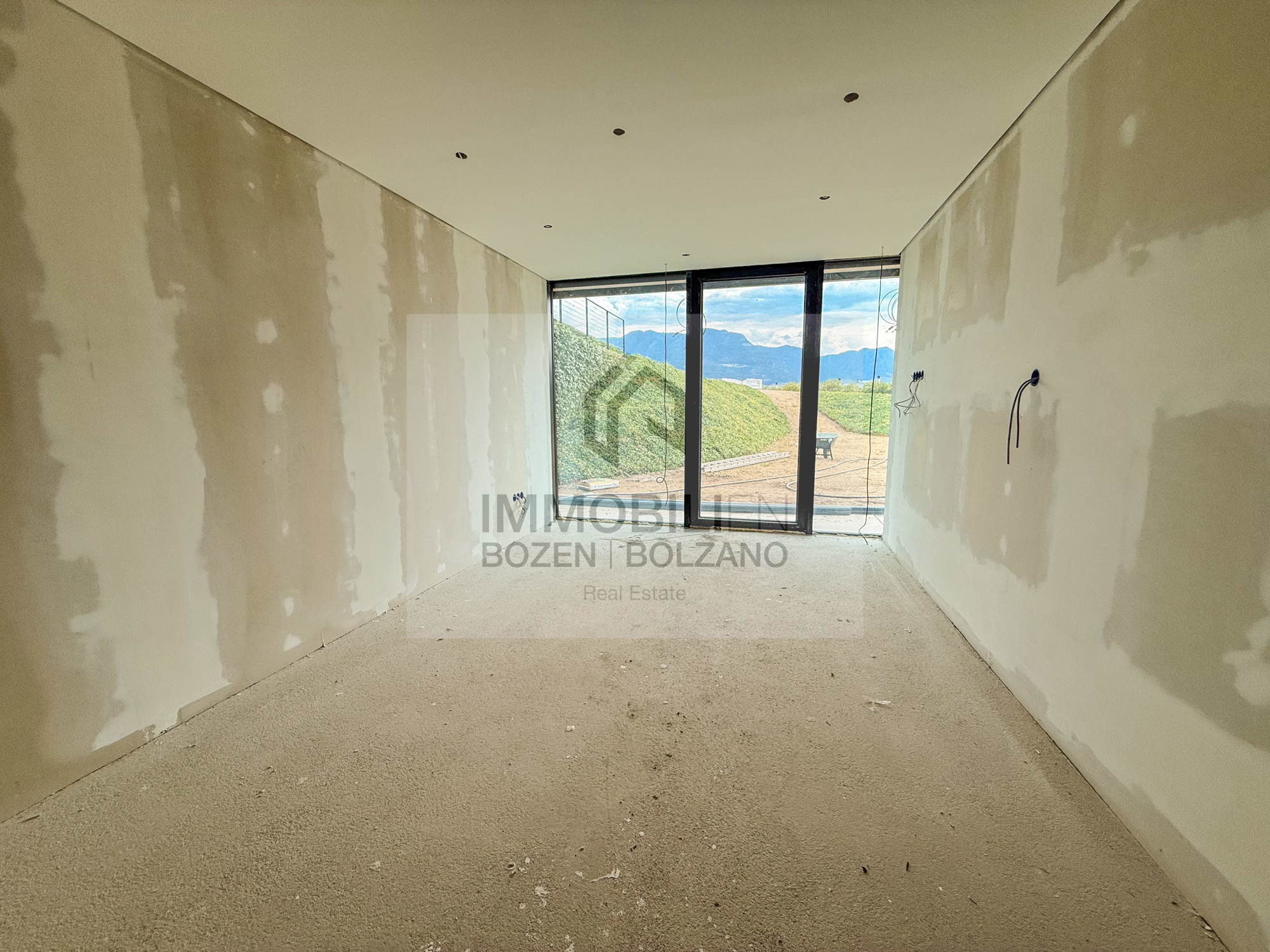 Diese luxuriöse Villa befindet sich Südlich von Bozen, in einer ruhigen und unverbauten Lage, eingebettet im Grünen. Sie ist Teil eines hochwertigen Neubauprojektes bestehend aus zwei autonomen aneinandergereihten Villen und erstreckt sich auf zwei Etagen. Sie ist nach Südwest ausgerichtet und hat einen freien Blick. Im oberen Stockwerk befindet sich ein großzügiges Wohnzimmer, eine große Wohnküche, ein Tages WC, eine Speisekammer und die Treppe, die ins untere Geschoss führt. Die raumhohen Fenster verleihen diesem Tagesbereich ein sehr angenehmes Klima und sorgen für sehr viel Tageslicht. Im Obergeschoss befinden sich auch 2 große Terrassen, die zum Entspannen einladen. Von hier aus gelangt man auch direkt zum Pool. In der unteren Etage befinden sich 3 / 4 helle Schlafzimmer mit raumhohen Fensterfronten und großen Bädern. Zudem beinhaltet diese Etage einen Waschraum und einen Keller sowie eine große Garage, welche Platz für drei Autos bietet. Ein zusätzlicher Autostellplatz befindet sich im Freien. Von diesem Stockwerk gelangt man auch in den wunderschönen und absolut privacy-geschützten Garten. Beheizt wird die Villa durch eine Deckenheizung welche durch eine Wärmepumpe. Eine Photovoltaikanlage und eine Solaranlage runden die technischen Anlagen ab. Sehr gute Anbindung an allen öffentlichen Verkehrsmitteln (auch Flughafen). Die angegebenen Informationen sind indikativ und können Abänderungen unterliegen.