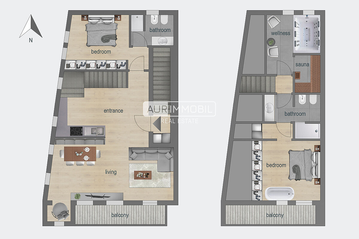 Die zweistöckige Wohnung besteht aus einem Eingangsbereich, einem Wohnbereich mit Küche, einem Schlafzimmer, einem Badezimmer und einem Balkon im zweiten Stock. Eine Treppe führt in das Obergeschoss, wo sich ein weiteres Schlafzimmer, ein Badezimmer, ein Balkon und ein Wellnessbereich mit Sauna und Whirlpool befinden.
