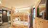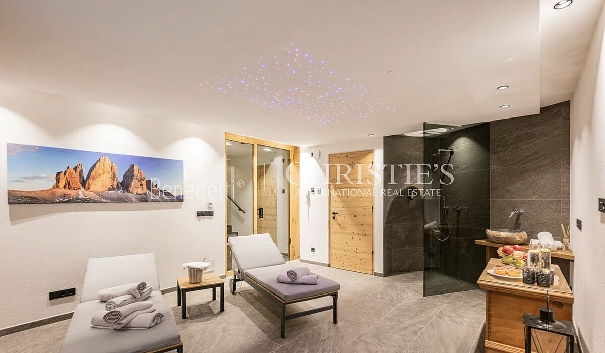 Im Erdgeschoss befindet sich ein stilvoller privater Wellnessbereich, ideal zum Entspannen nach einem Tag an der frischen Bergluft. Die Spa-Anlage verfügt über einen Whirlpool, eine Sauna sowie einen komfortablen Ruhebereich und wird durch ein separates Badezimmer ergänzt, das dem Wellnessbereich dient. Von dieser Ebene aus gelangt man zudem auf eine kleine Außenterrasse, die sich perfekt eignet, um die frische Luft der Dolomiten zu genießen und die Ruhe der alpinen Landschaft auf sich wirken zu lassen.
