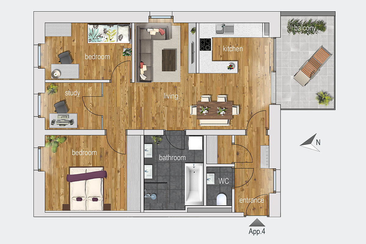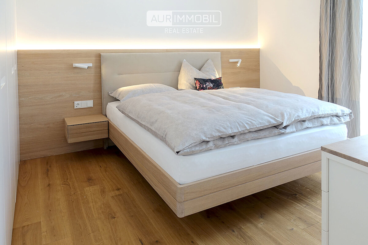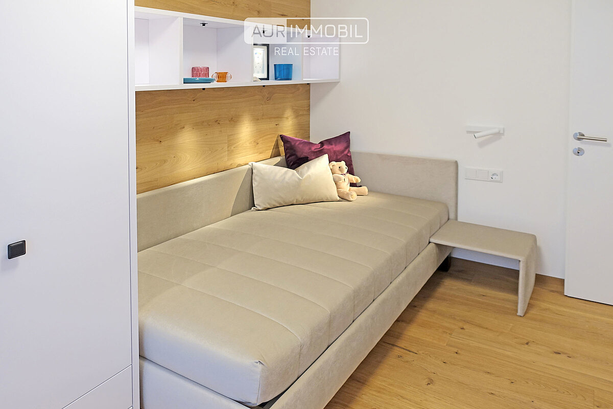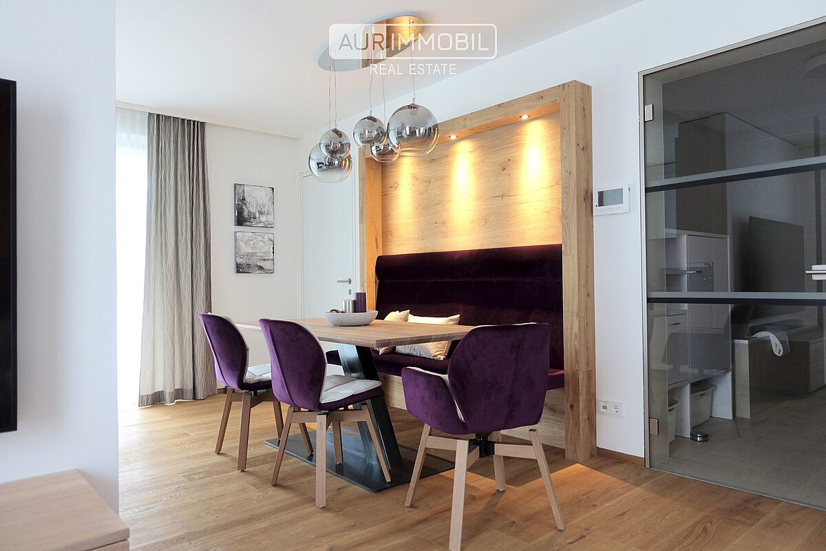 Dieses hochwertig möblierte Apartment im ersten Obergeschoss besteht aus einem Eingang, einem offenen Living Room mit Küche und Essbereich, zwei Schlafzimmern, einem Badzimmer, einem Tages-WC, einem Arbeitsraum und einem Südbalkon.