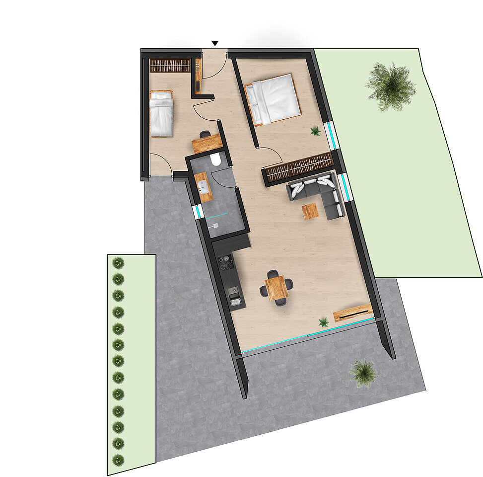 Mit einem privaten Garten von rund 140 m² entsteht ein großzügiger Außenbereich, der den Wohnraum harmonisch erweitert und vielseitige Nutzungsmöglichkeiten bietet. Die Wohnung verfügt über zwei Schlafzimmer, ein stilvolles Badezimmer sowie einen offenen Wohnbereich mit integrierter Küche. Großzügige Glasflächen sorgen für helle Räume und schaffen fließende Übergänge zwischen Innen- und Außenbereich.