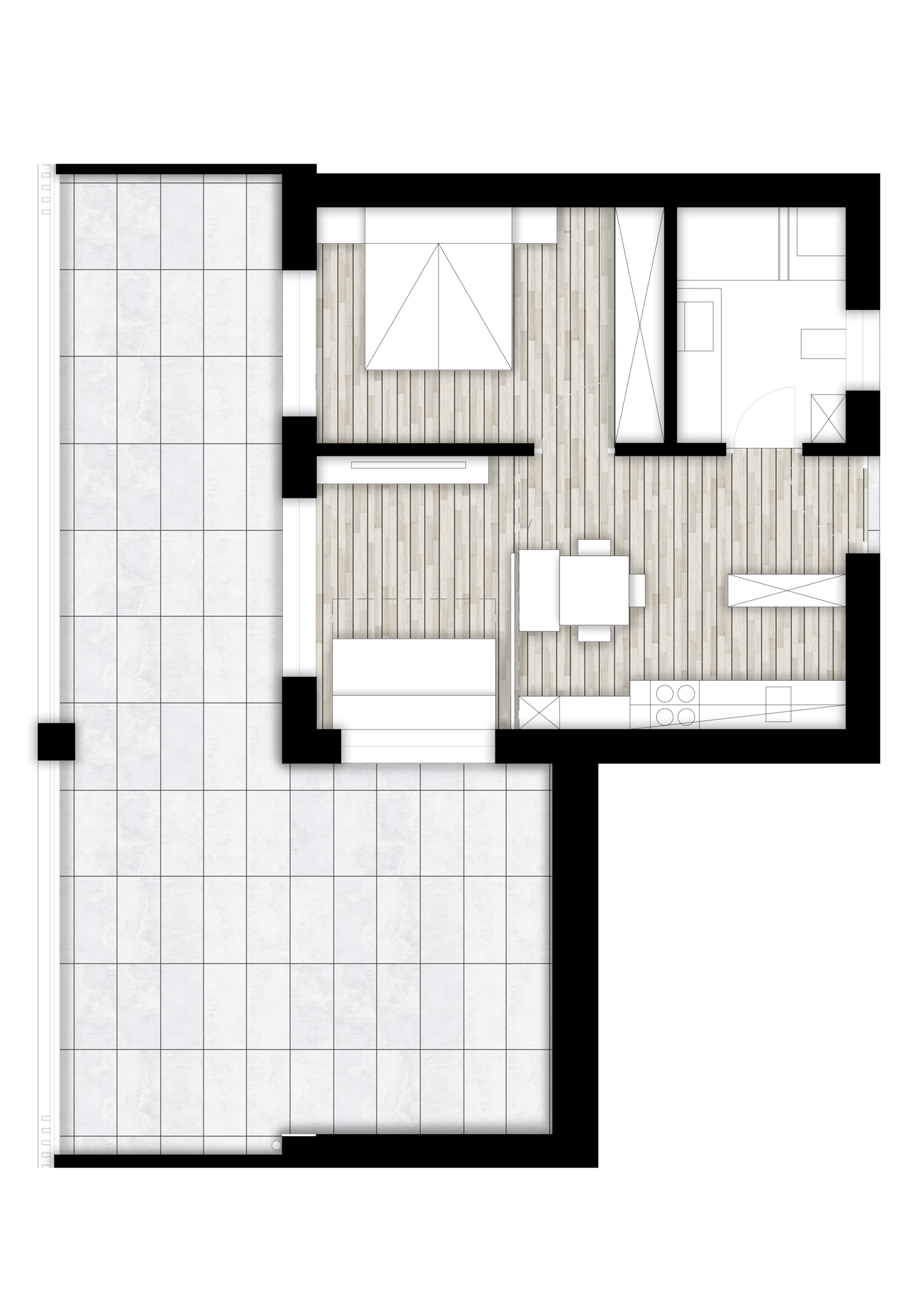 Diese einzigartige Penthousewohnung setzt sich zusammen aus einem modernen gemütlichem Wohnraum mit Küche, einem Schlafzimmer, einem funktionalem Badezimmer und einer großzügigen und sonnenverwöhnten Terrasse mit Weitblick.