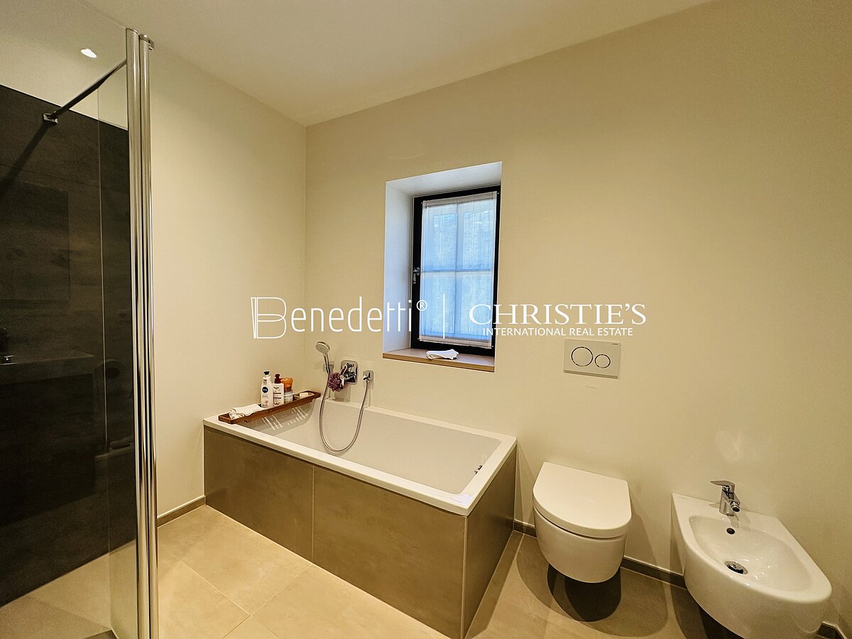 Im Obergeschoss befinden sich weitere Schlafzimmer und ein zusätzlicher Wohnbereich, der mit einem Kamin und eigener Küche ausgestattet ist – ideal für Gäste oder als Rückzugsort. Das Dachgeschoss beherbergt ein weiteres Schlafzimmer mit eigenem Bad, das eine abgeschlossene Privatsphäre garantiert.