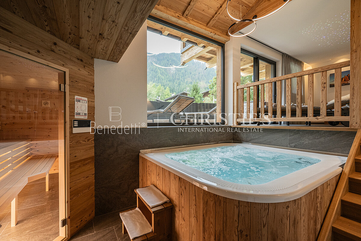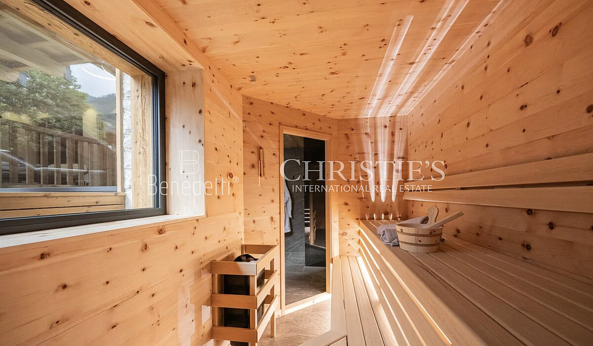 Im Erdgeschoss befindet sich ein eleganter privater Wellnessbereich, ideal, um nach einem Tag in den Bergen Momente der vollkommenen Entspannung zu genießen. Hier stehen eine Sauna, ein Whirlpool sowie ein komfortabler Ruhebereich zur Verfügung. Zudem besteht Zugang zu einer kleinen Außenterrasse, auf der man die frische Luft der Dolomiten genießen kann. Ein zusätzliches Badezimmer im Wellnessbereich sorgt für noch mehr Funktionalität und Komfort.