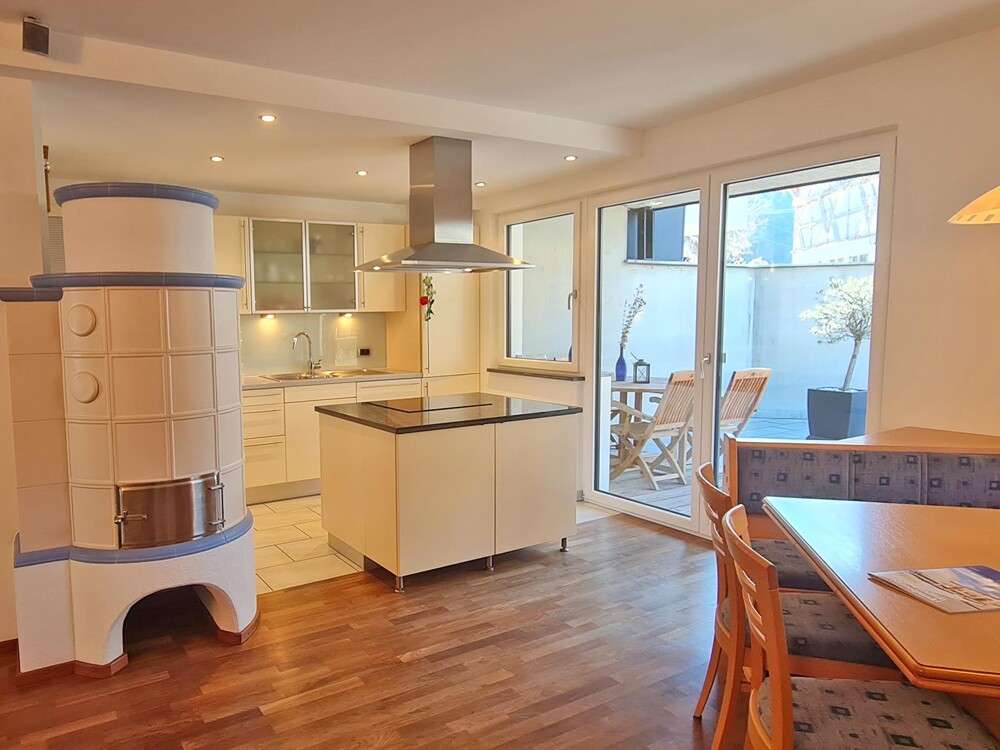 ERDGESCHOSS Offener Wohn- und Kochbereich mit schönem Kachelofen, Studio, Eingangsbereich mit Garderobe, Tages-WC, Abstellraum und Terrasse mit Süd-Westausrichtung u. Abendsonne