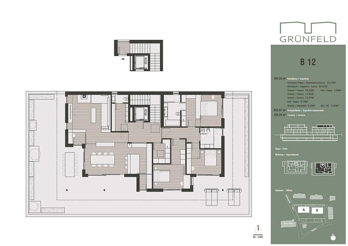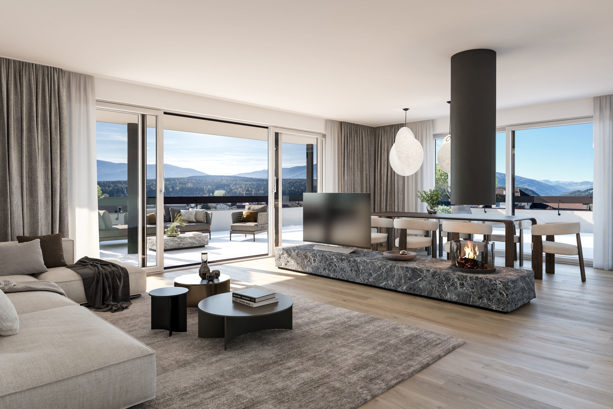 Mit einer großzügigen Wohnfläche bietet dieses Penthouse außergewöhnlichen Komfort und Raum. Der offene Wohn- und Essbereich ist lichtdurchflutet und ermöglicht einen weiten Blick in die Natur. Ein stilvoller Kamin mit Ofen sorgt dabei für zusätzliche Wärme und eine besonders behagliche Atmosphäre. Bodentiefe Fenster verbinden den Innenbereich mit der 187 m² großen Dachterrasse und lassen die Schönheit der Berge in jedes Zimmer strömen. Drei großzügige Schlafzimmer, eines davon mit en-suite Bad, bieten Platz für Ruhe und Erholung. Ebenso gehören insgesamt drei Bäder und ein Hauswirtschaftsraum zur Wohnung. Mit dem Aufzug des Gebäudes gelangt man direkt und bequem in den offenen Eingangsbereich, welcher viel Stauraum bietet.
