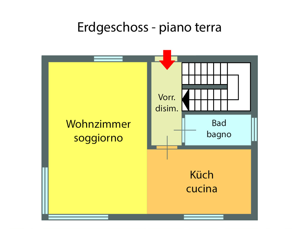 Im Erdgeschoss befinden sich der Eingangsbereich sowie eine helle Wohnküche mit integriertem Essbereich. Von hier aus gelangt man direkt in den kompakten, pflegeleichten Außenbereich, der das Haus umgibt und sich ideal zum Entspannen im Freien eignet. Ebenfalls im Erdgeschoss befindet sich ein Tages-WC. Im 1. Stock erwarten Sie drei Schlafzimmer, die jeweils Zugang zu zwei Balkonen mit sonniger Südwest-Ausrichtung bieten. Das großzügige Badezimmer ist mit einer Dusche, einer Badewanne sowie einem modernen WC mit Bidet-Funktion ausgestattet. Über eine ausziehbare Leiter ist der Dachboden erreichbar, welcher zusätzlichen Stauraum bietet.