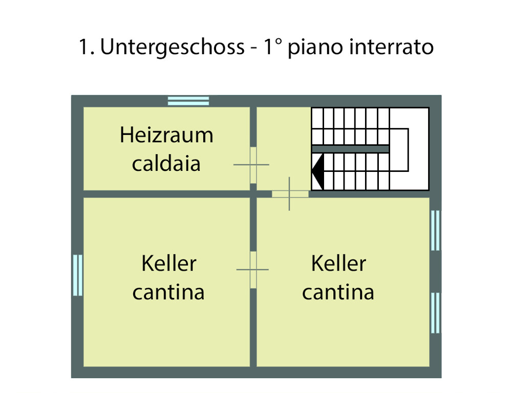 Im ersten Untergeschoss befinden sich zwei Kellerräume sowie ein Heizraum mit Pelletheizung.