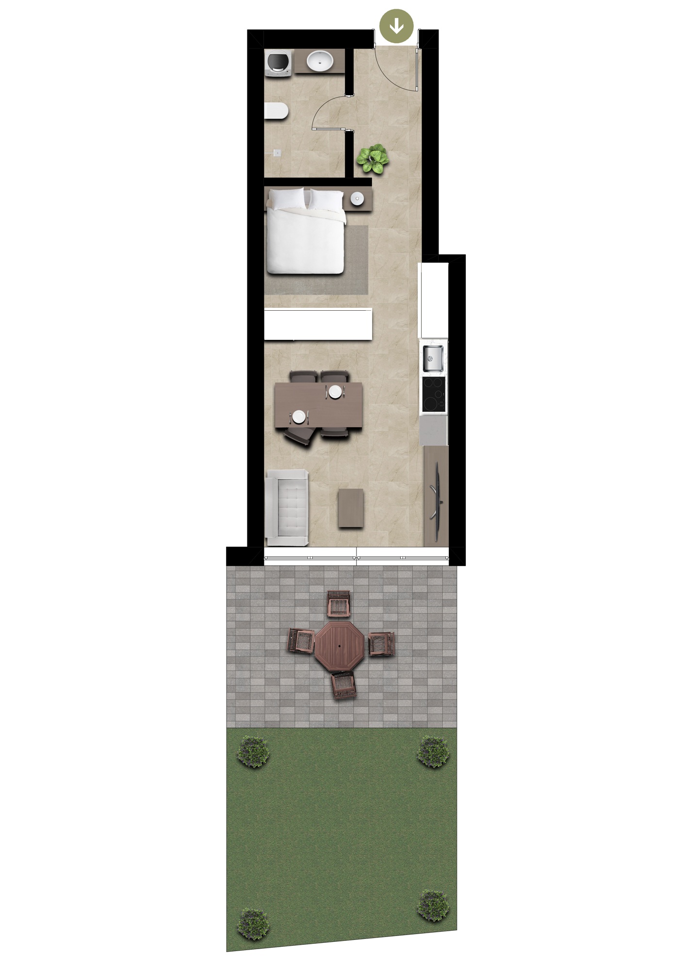Und wie bei jeder Einheit: Die Gemeinschaftsfläche mit Wiese und solarbetriebener Wasserfläche steht Ihnen jederzeit offen – ein Ort der Ruhe, Form und Nachhaltigkeit.