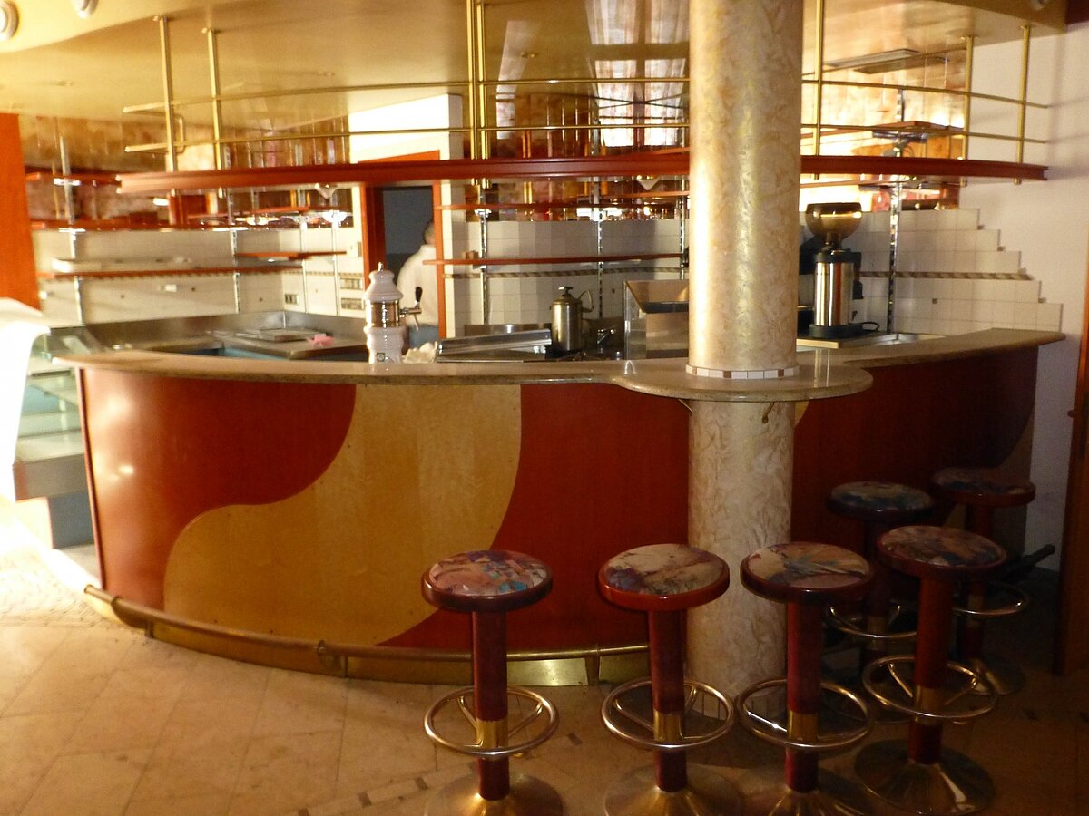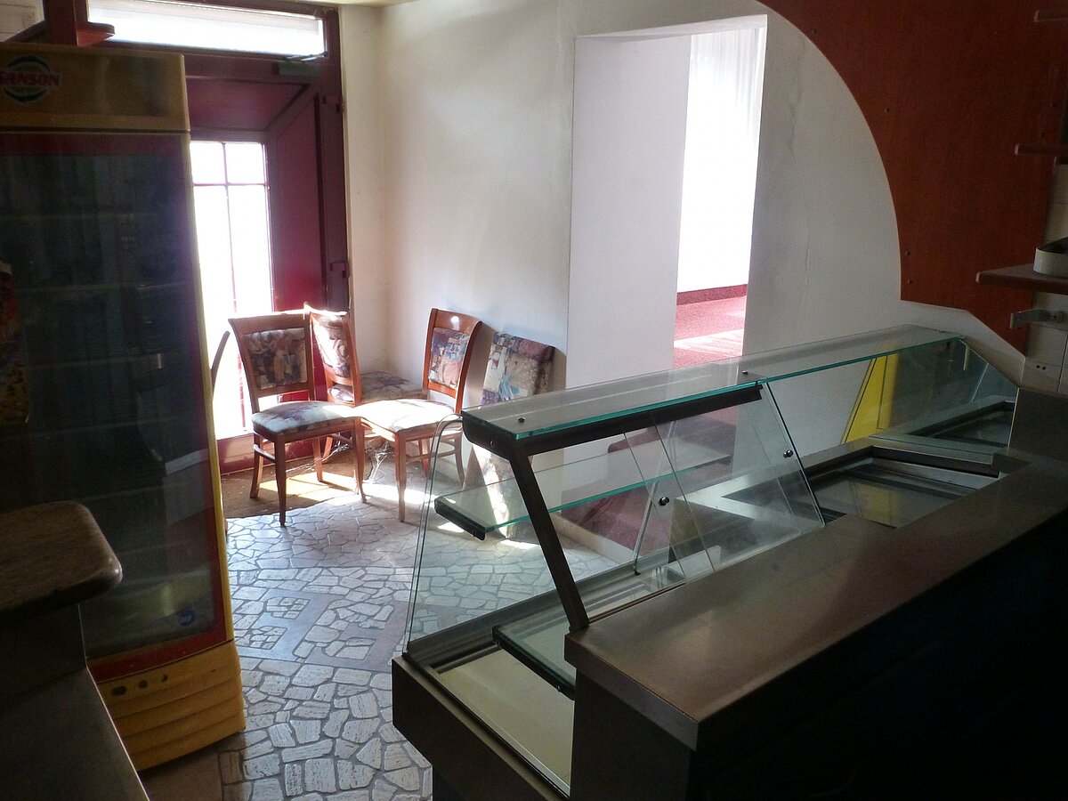Das CAFÈ nimmt die ganze, von allen Seiten gut einsichtbare Fassade des Hauses ein. Es wurde ursprünglich sogar als Konditorei geplant. Der leere Nebenraum bietet sich als Verkaufsladen an. Hat eine schöne aktuelle Einrichtung, die Bartheke in INOX mit Mehlspeisenvetrine etc;