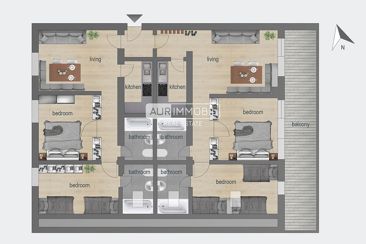 Die Wohnung besteht aus einem Eingangsbereich, zwei Wohnzimmern, zwei separaten Küchen, vier Schlafzimmern, vier Badezimmern und einem Balkon.