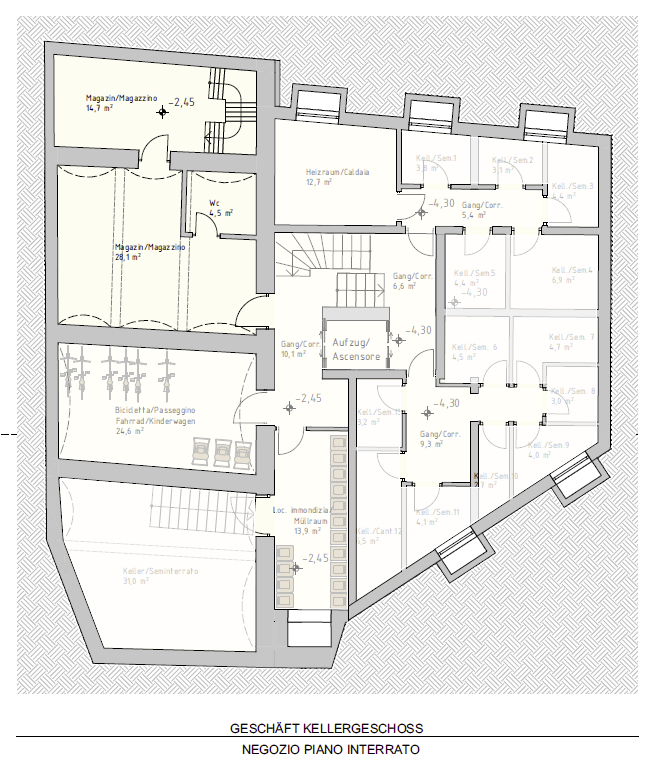 Das Magazin im Untergeschoss ist über eine interne Treppe erreichbar und hat eine Nettofläche von ca. 47 Quadratmetern. Auf dieser Etage befindet sich auch eine kleine Tagestoilette.