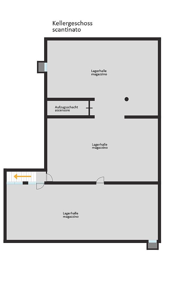 Das gesamte Gebäude ist unterkellert mit einer weiteren Lagerfläche von 506m², einer Höhe von 3,30m und ist über einen Aufzugschacht oder eine externe Treppe erreichbar. Zudem besteht die Möglichkeit, das Kellergeschoss über eine Garagenrampe zu erschließen, um mit Autos oder Lieferfahrzeugen ins Kellergeschoss zu gelangen.