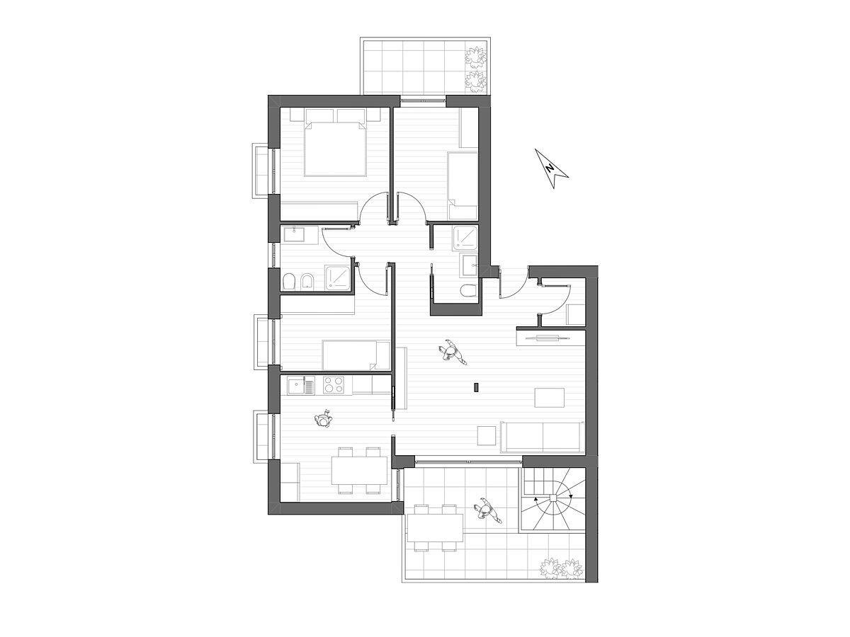 Dieses Penthouse liegt im vierten Obergeschoss eines hochwertigen Neubaus in Meran. Der Grundriss überzeugt mit einem offenen Wohn-Essbereich, drei Schlafzimmern, zwei modernen Bädern – eines davon mit Fenster – sowie einem praktischen Abstellraum. Vom Wohnbereich aus gelangt man direkt auf die sonnige Südterrasse, die den Wohnraum ins Freie erweitert. Ein besonderes Highlight ist die private Dachterrasse, die über eine externe Treppe erreichbar ist – ideal zum Entspannen und Genießen von Sommerabenden mit Blick über die Stadt. Die Wohnung ist bequem per Aufzug erreichbar und befindet sich in zentrumsnaher, krankenhausnaher Lage mit guter Anbindung an öffentliche Verkehrsmittel. Der Neubau wurde nach dem Standard eines Klimahauses A Nature errichtet. Garagen sind gegen Aufpreis erhältlich. Da es sich um einen Neubau handelt, können persönliche Wünsche bei der Innenausstattung berücksichtigt und das Innere individuell gestaltet werden.
