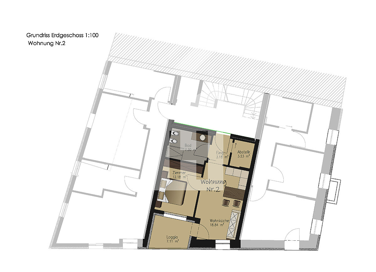 Schlafzimmer, großzügiges Bad, Wohnküche, Abstellraum, Loggia
