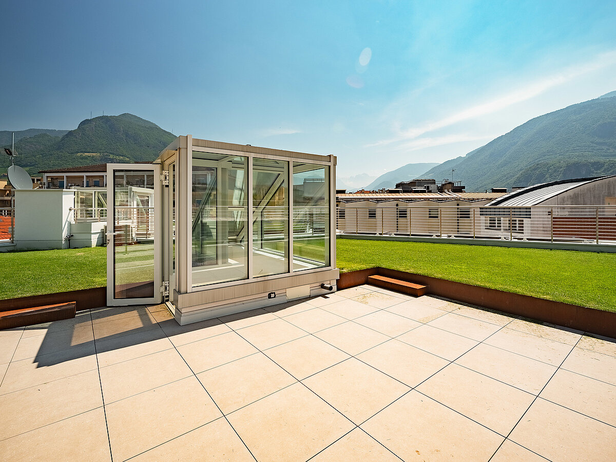 Im Bozner Stadtteil Gries-Quirein finden Sie diese großzügige Attikawohnung mit atemberaubender Dachterrasse. Der Wohntraum besteht aus einer eigenständigen Küche mit Balkon, einem hellen Wohnzimmer ebenfalls mit eigener Terrasse, zwei Kinderzimmern sowie dem Hauptschlafzimmer, ein Tages WC und zwei größeren Badezimmern, abgerundet wird das Immobilienangebot mit einer privaten Dachterrasse bestehend aus einem Teil Rollrasen und einem Teil Fließen Boden. Die Heizung erfolgt durch Fernwärme über Fußbodenheizung. Die Wohnung ist mit einem Smart-Home-System sowie einer installationsbereiten Alarmanlage ausgestattet. Das Gebäude verfügt über einen Aufzug, der alle Stockwerke verbindet. Zudem kann eine Garagen ab einem Preis von 65.000 € gekauft werden. Diese moderne Immobilie bietet Komfort, Sicherheit und viel Raum für ein angenehmes Wohnen in einer exklusiven Lage.