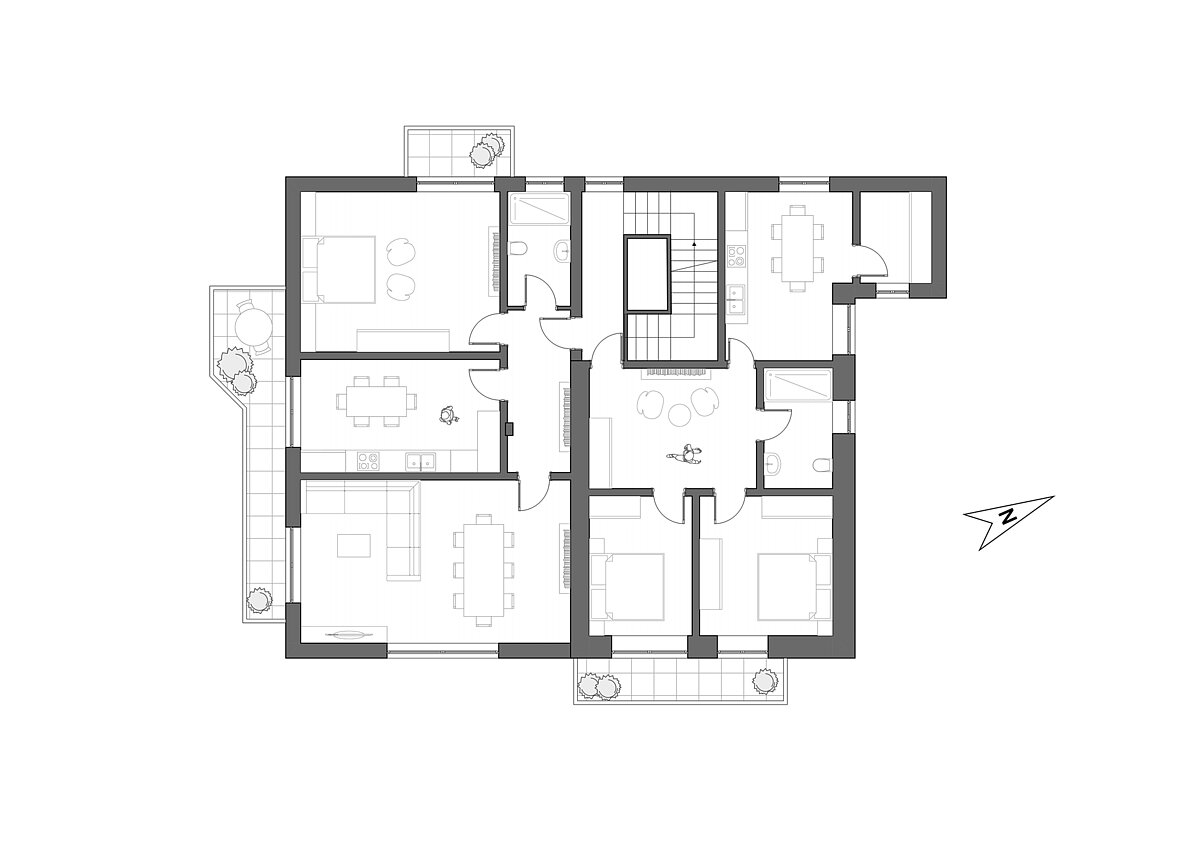 Diese Lösung ist ideal für Unternehmer, die Wohn- und Arbeitsbereich an einem Standort vereinen möchten, oder für jene, die ein neues Projekt entwickeln wollen und dabei das vorhandene Bauvolumen des Grundstücks optimal ausschöpfen möchten.