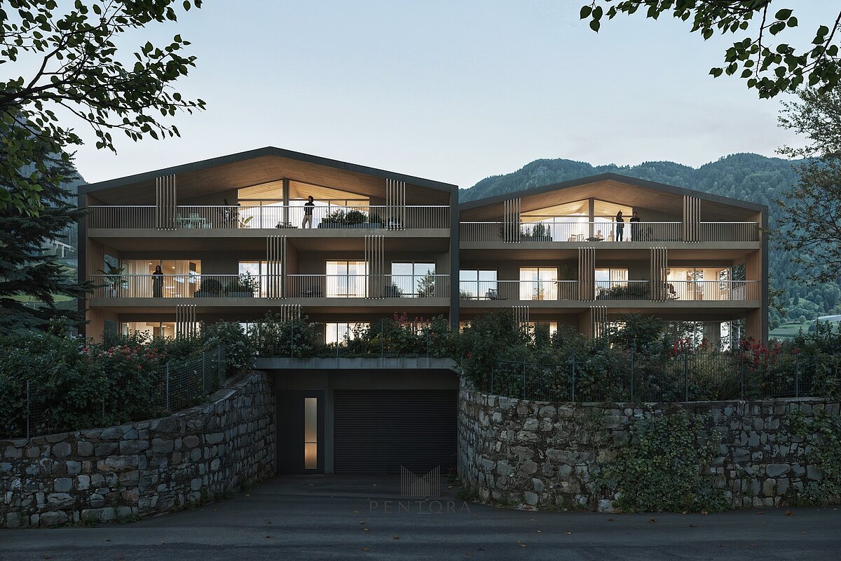 Dieses großzügige Penthouse im obersten Stock ist für alle gedacht, die maximale Weite, Privatsphäre und einen freien Blick über Meran suchen. Die erhöhte Hanglage des Projekts sorgt dafür, dass sich aus jeder Etage ein Panorama auf die Bergkulisse öffnet, hier oben wird daraus ein echtes Wohngefühl von Höhe und Leichtigkeit. Die Wohnung bietet weitläufige Innenräume, klare Zonierung und eine große Panorama-Terrasse als Mittelpunkt des Wohnens. Großformatige Hebeschiebetüren holen Licht und Landschaft ins Innere und schaffen ein fließendes Indoor-Outdoor-Living. Die Ausstattung folgt dem hochwertigen Standard des Hauses: edles Holzparkett, fein abgestimmte Oberflächen sowie frostsichere Außenbeläge. Technisch ist das Penthouse für zeitgemäßes, komfortables Wohnen ausgelegt. Die Smart-Home-Lösung auf KNX-Basis ermöglicht die Steuerung von Heizung und Beschattung per Smartphone oder Tablet; Sensorik unterstützt energieeffizientes Leben im KlimaHaus-A-Nature-Standard.