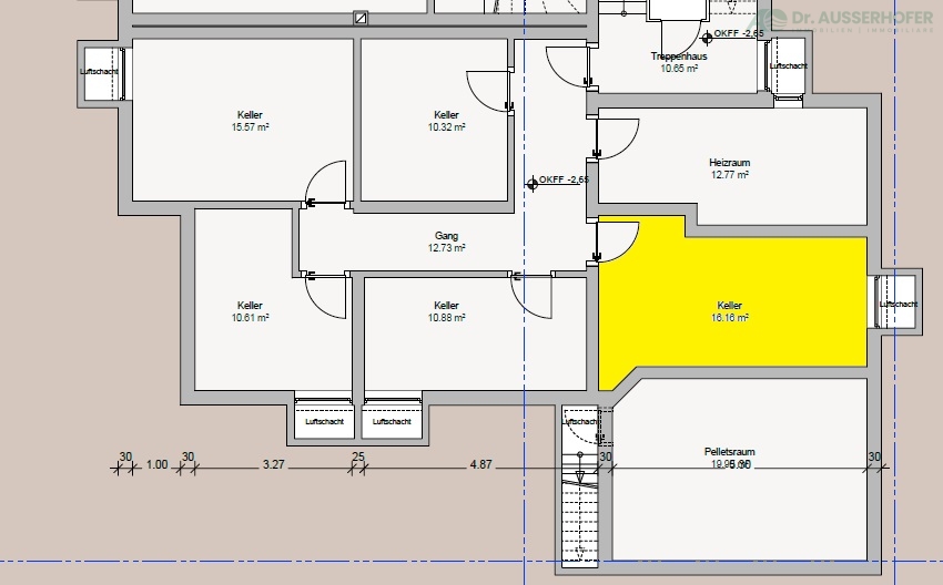 Im Untergeschoss befindet sich ein 16 m² großer Kellerraum mit Fenster. Ein Parkplatz im Freien ist im Kaufpreis inklusive.