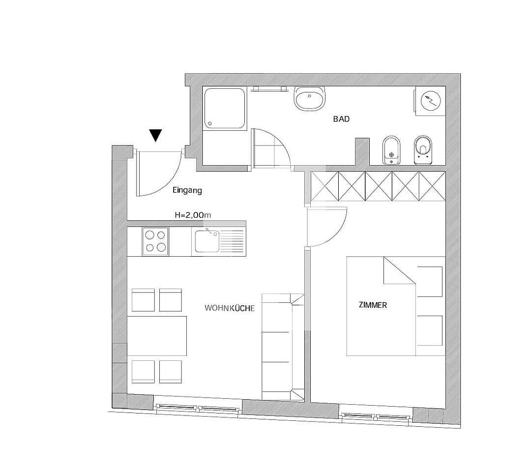 Die Wohnung bietet ein Schlafzimmer sowie einen einladenden Wohnbereich mit viel Potenzial zur individuellen Gestaltung. Ein Garagenstellplatz und ein Kellerraum sind im Kaufpreis inbegriffen und sorgen für zusätzlichen Komfort und Stauraum.