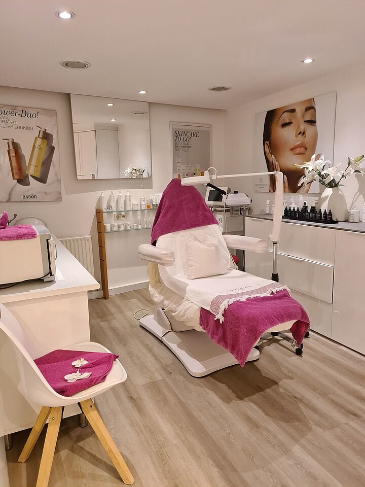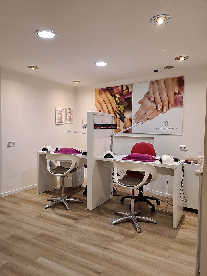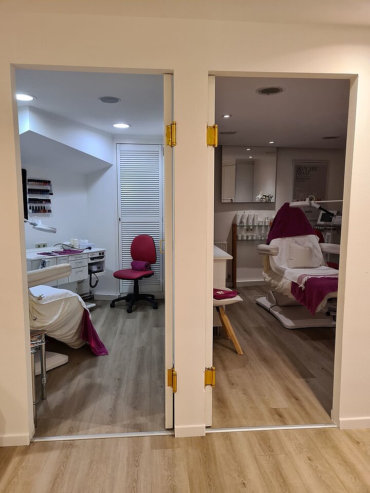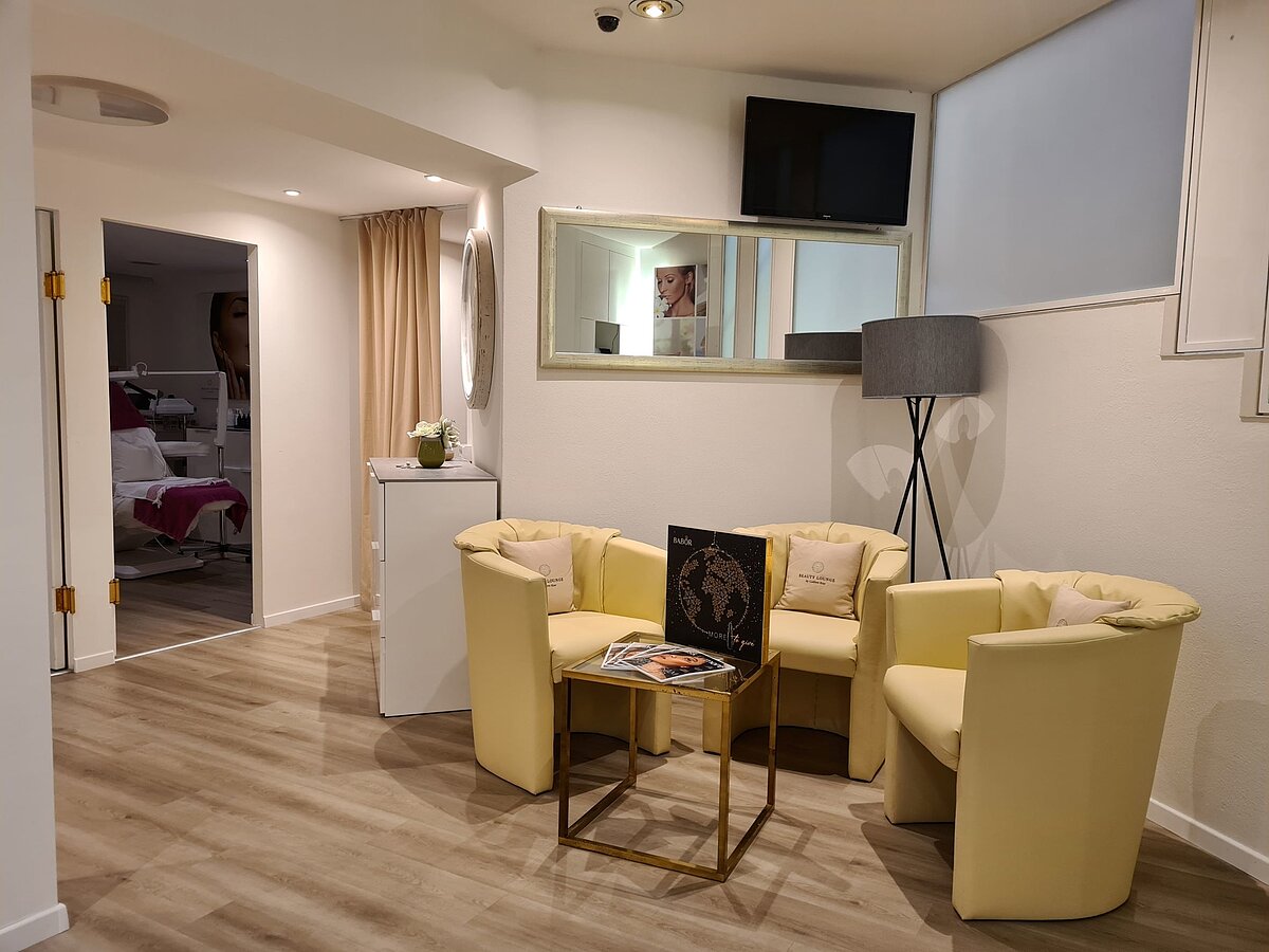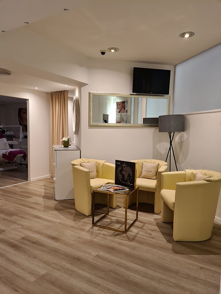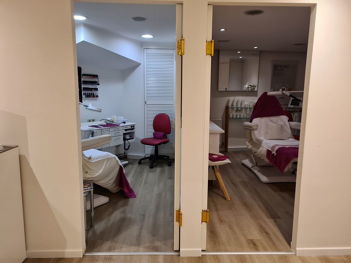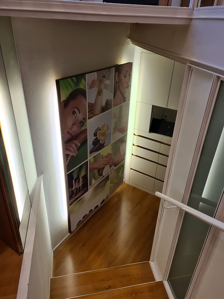 Im Untergeschoss finden sich die 4 Behandlungsräume des Kosmetiksalons, 1 offener Raum für Maniküre, ein Abstellraum und Gäste WC.