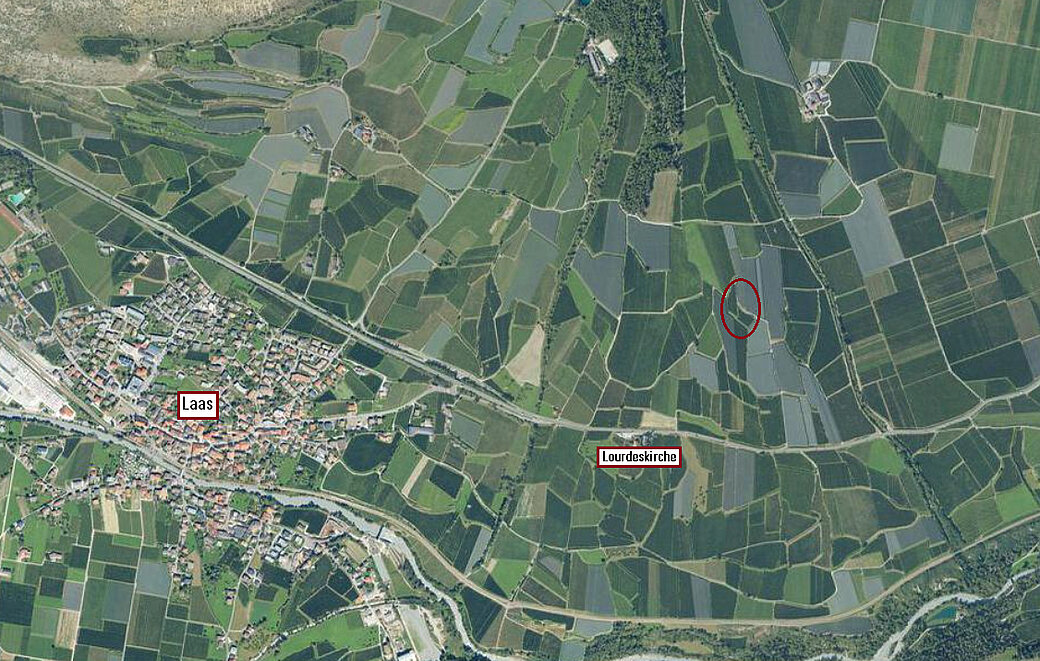 Zum Verkauf steht eine Obstwiese in der Nähe der Maria Lourdes Kirche in Laas.